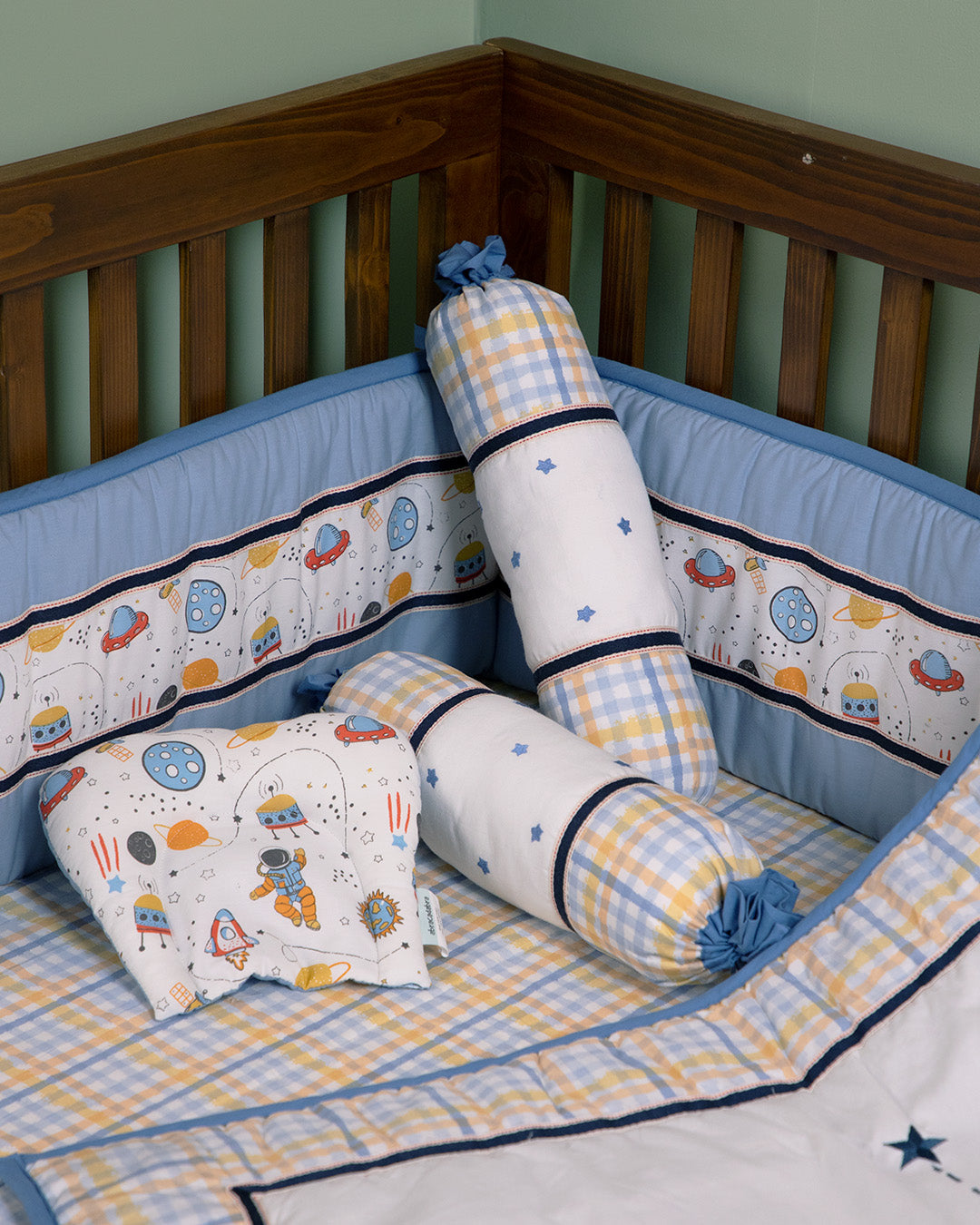 - Explore an ideal setting with a complete set that comes with a protective 6-piece cot bedding set, a four-sided bumper, a quilt, a flat sheet, two bolsters, and a neck pillow.