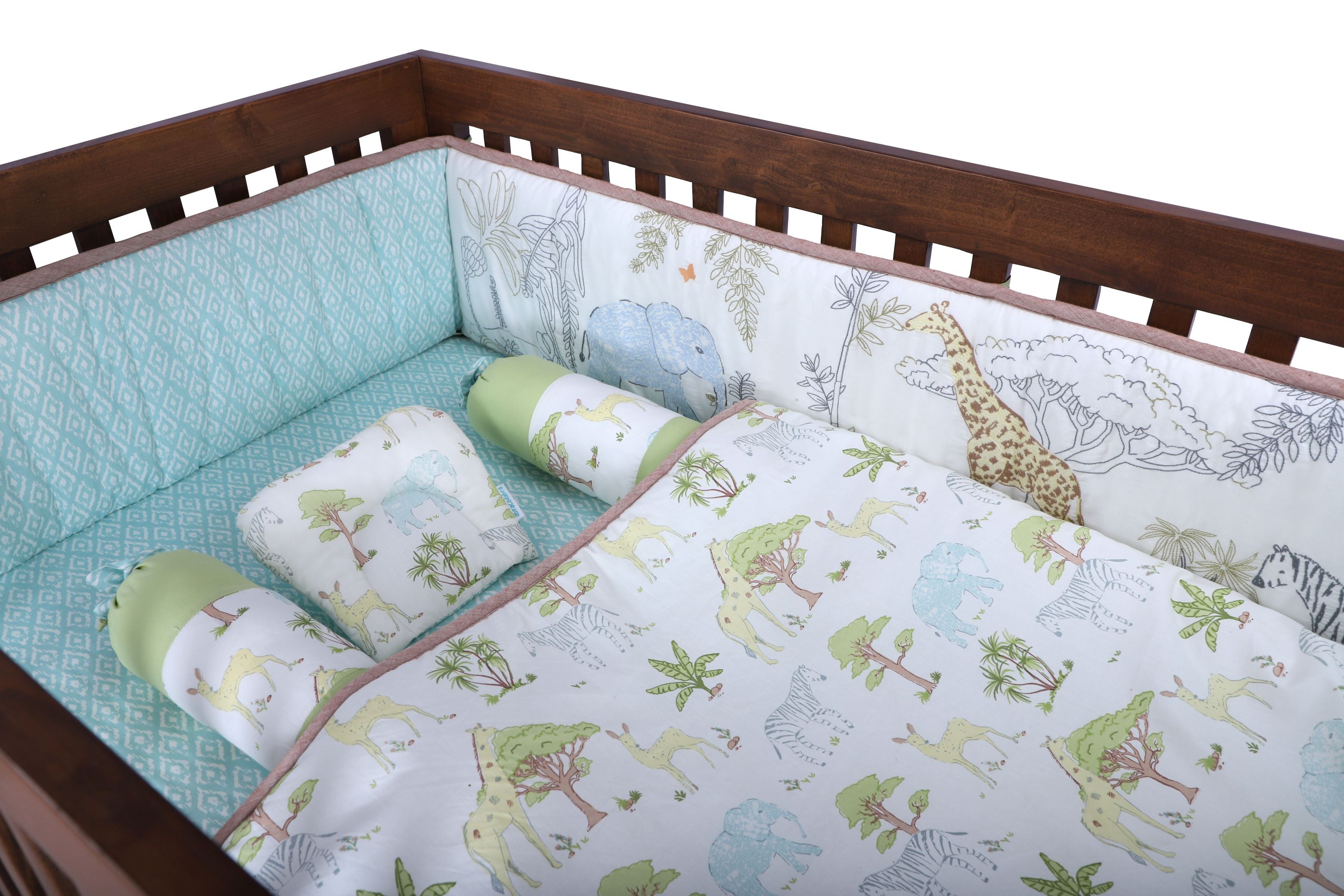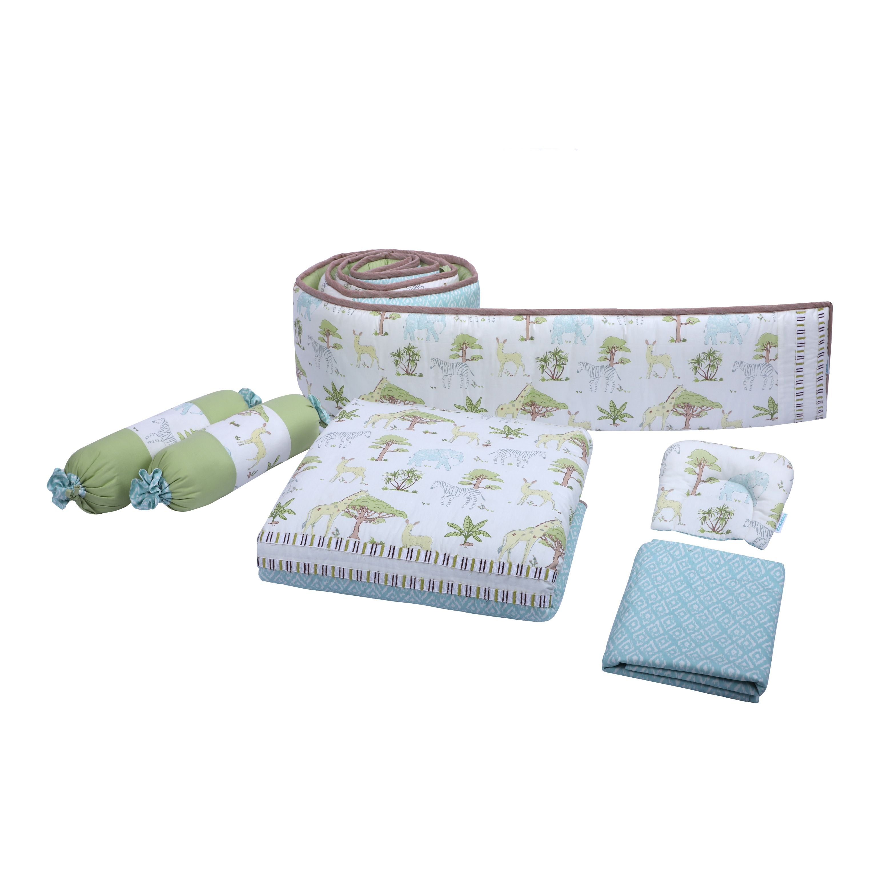 - Explore an ideal setting with a complete set that comes with a protective 6-piece cot bedding set, a four-sided bumper, a quilt, a flat sheet, two bolsters, and a neck pillow.