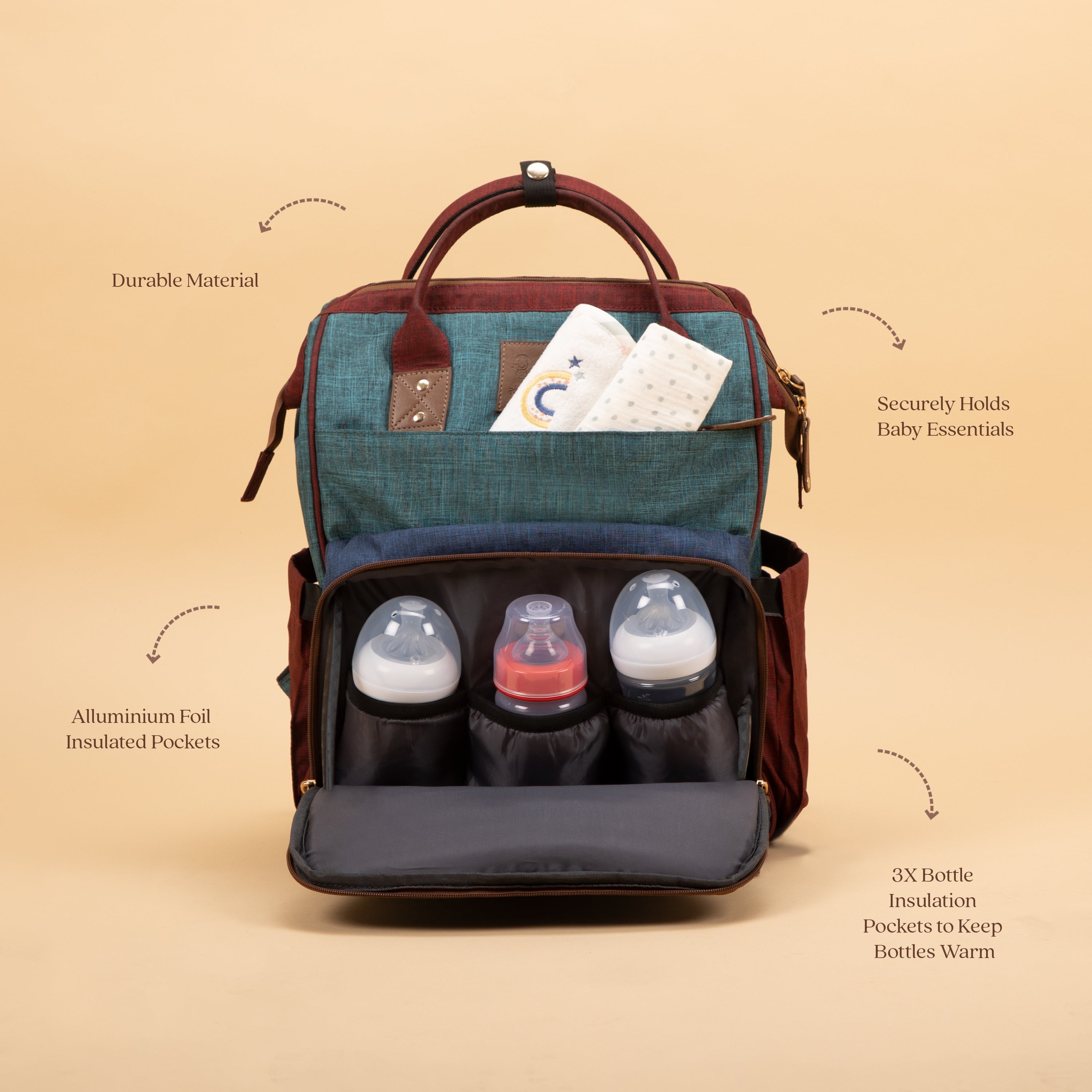 - Features a spacious interior with a large capacity and individual functional pockets that can hold all your essential items for baby care such as baby diaper, milk bottle, towel, changing pad and snacks etc