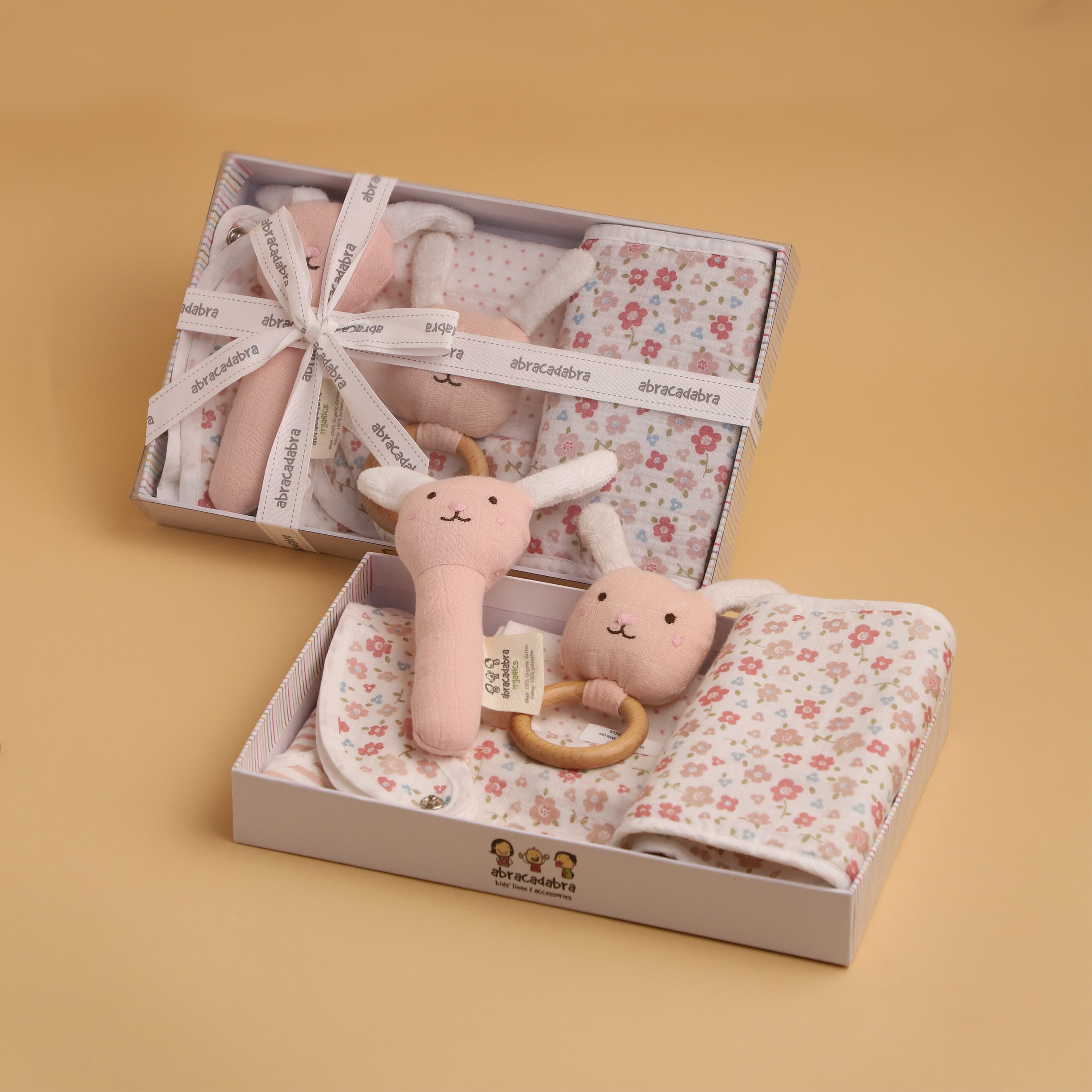 Quantity: 5N , Bibs - 29 x 20 cm, Burp Cloth - 38 x 17 cm, Muslin Wipes - 25 x 25 cm, Face rattle - 18 x 8 x 4 cm, Teether - 12 x 10 cm