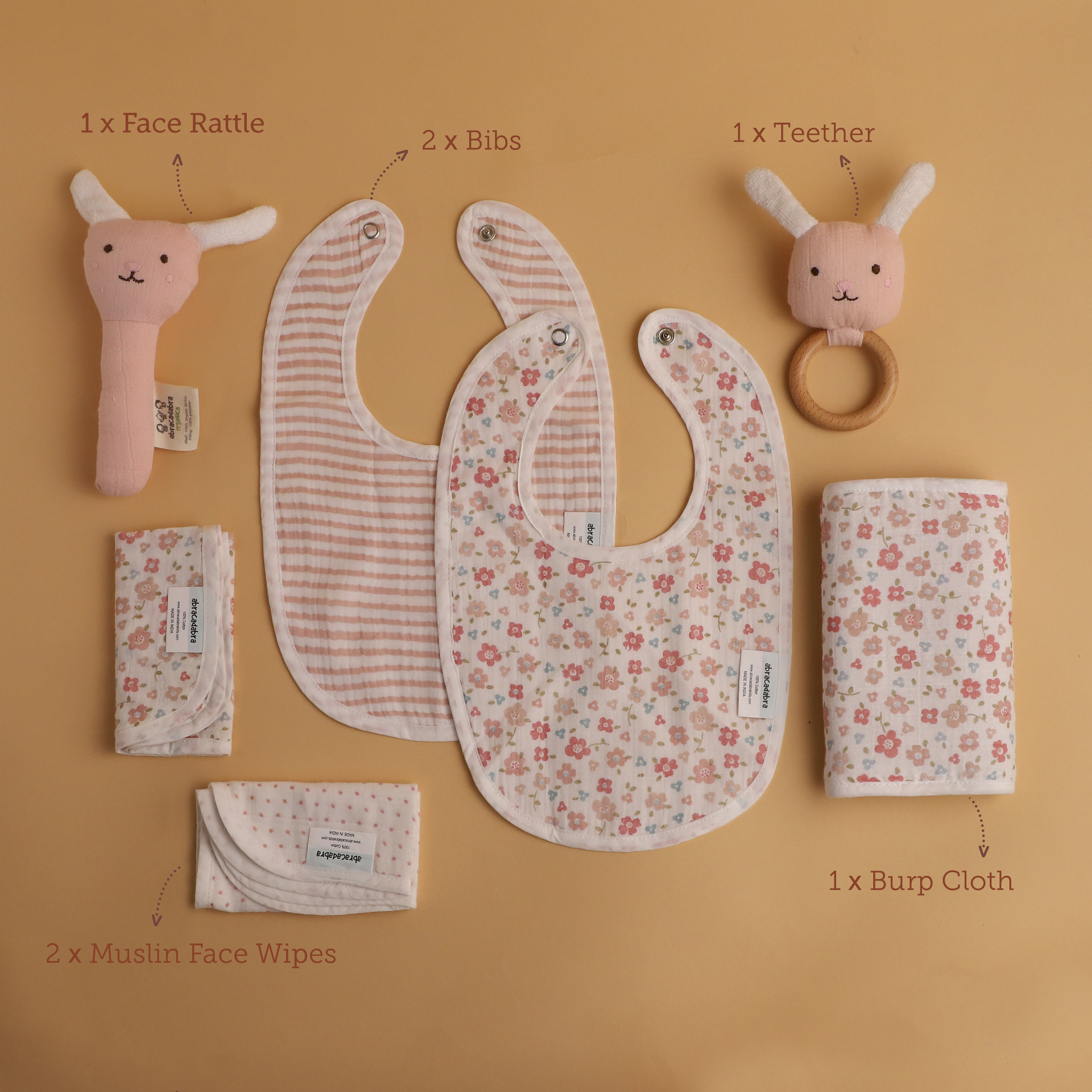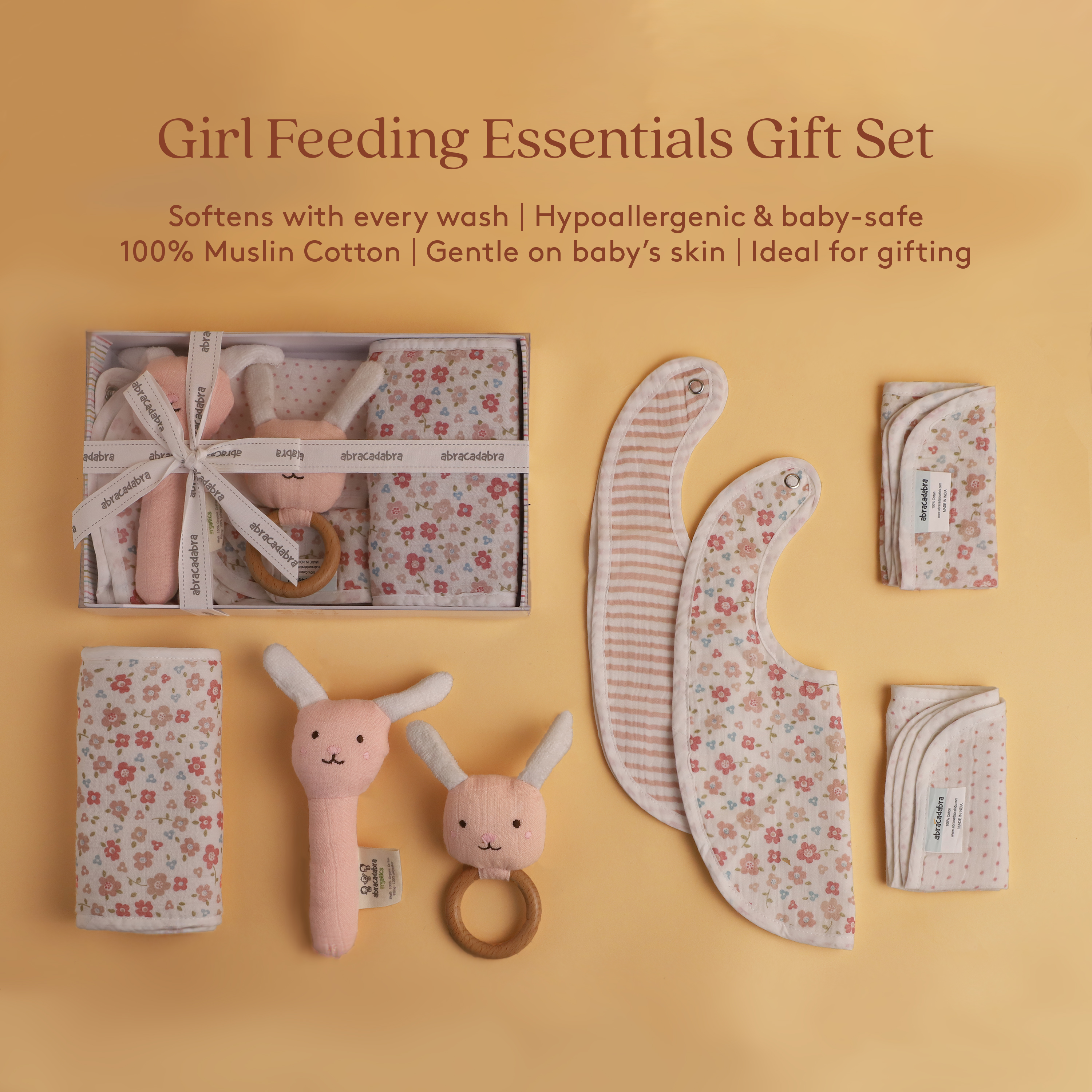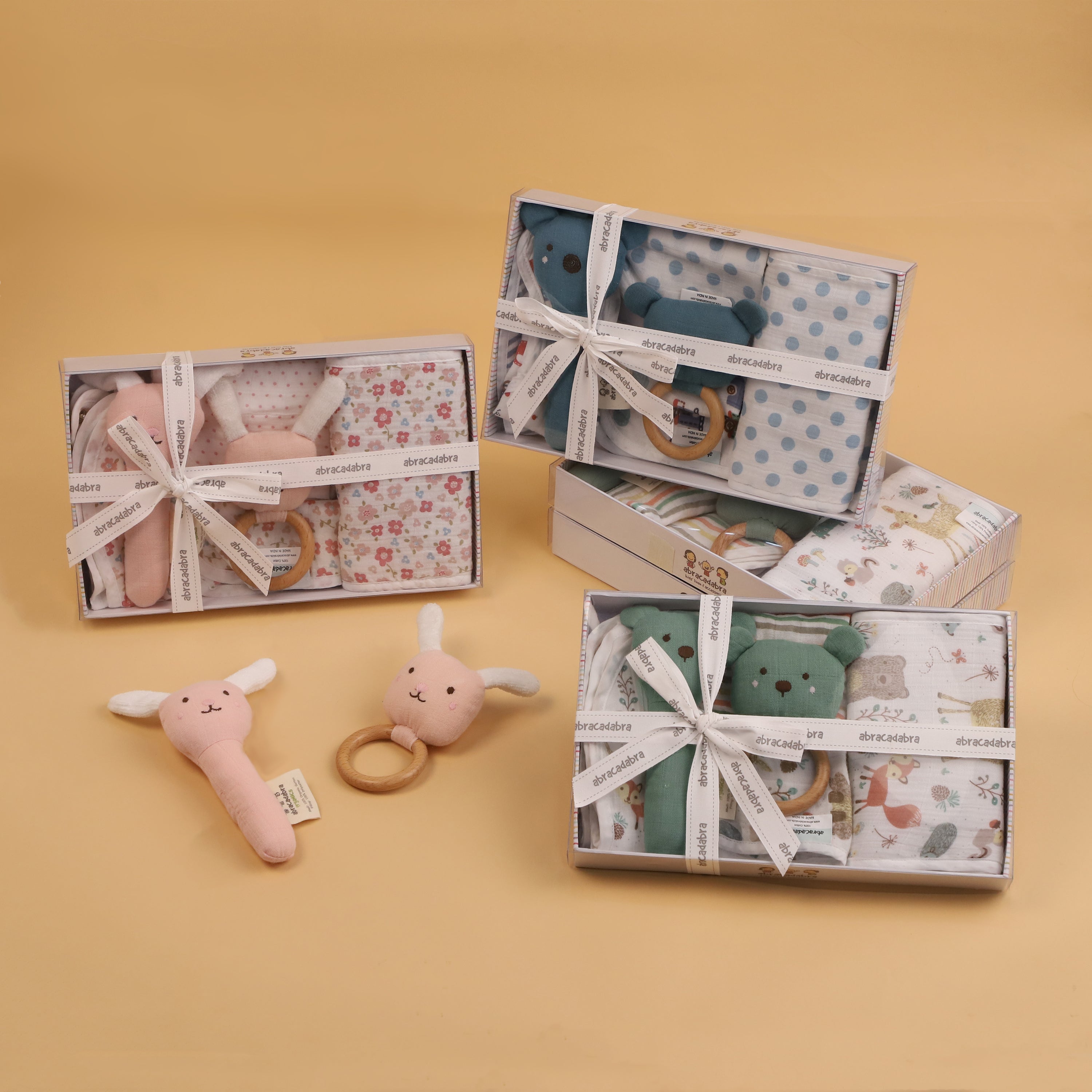A perfect set of newborn feeding essentials for babies 0-2 years, this curated gift box celebrates milestones and welcomes new arrivals with a blend of functionality and charm. Made from soft, premium muslin, it includes adorable prints and gentle teething toys, ensuring comfort and style. Each carefully selected item combines practicality with irresistible cuteness. Discover our lovingly crafted range of gifts to cherish every precious moment.