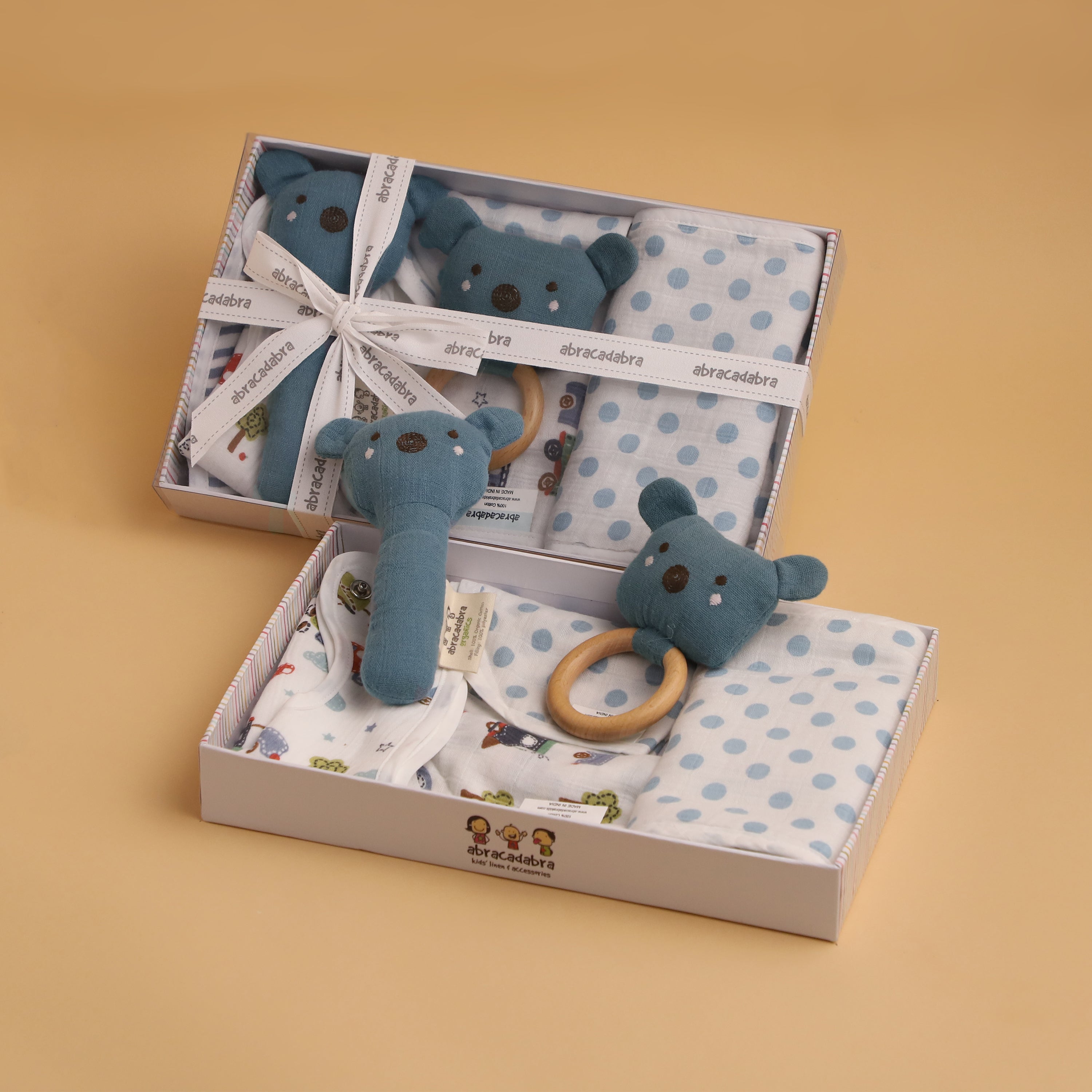 Quantity: 5N , Bibs - 29 x 20 cm, Burp Cloth - 38 x 17 cm, Muslin Wipes - 25 x 25 cm, Face rattle - 18 x 8 x 4 cm, Teether - 12 x 10 cm