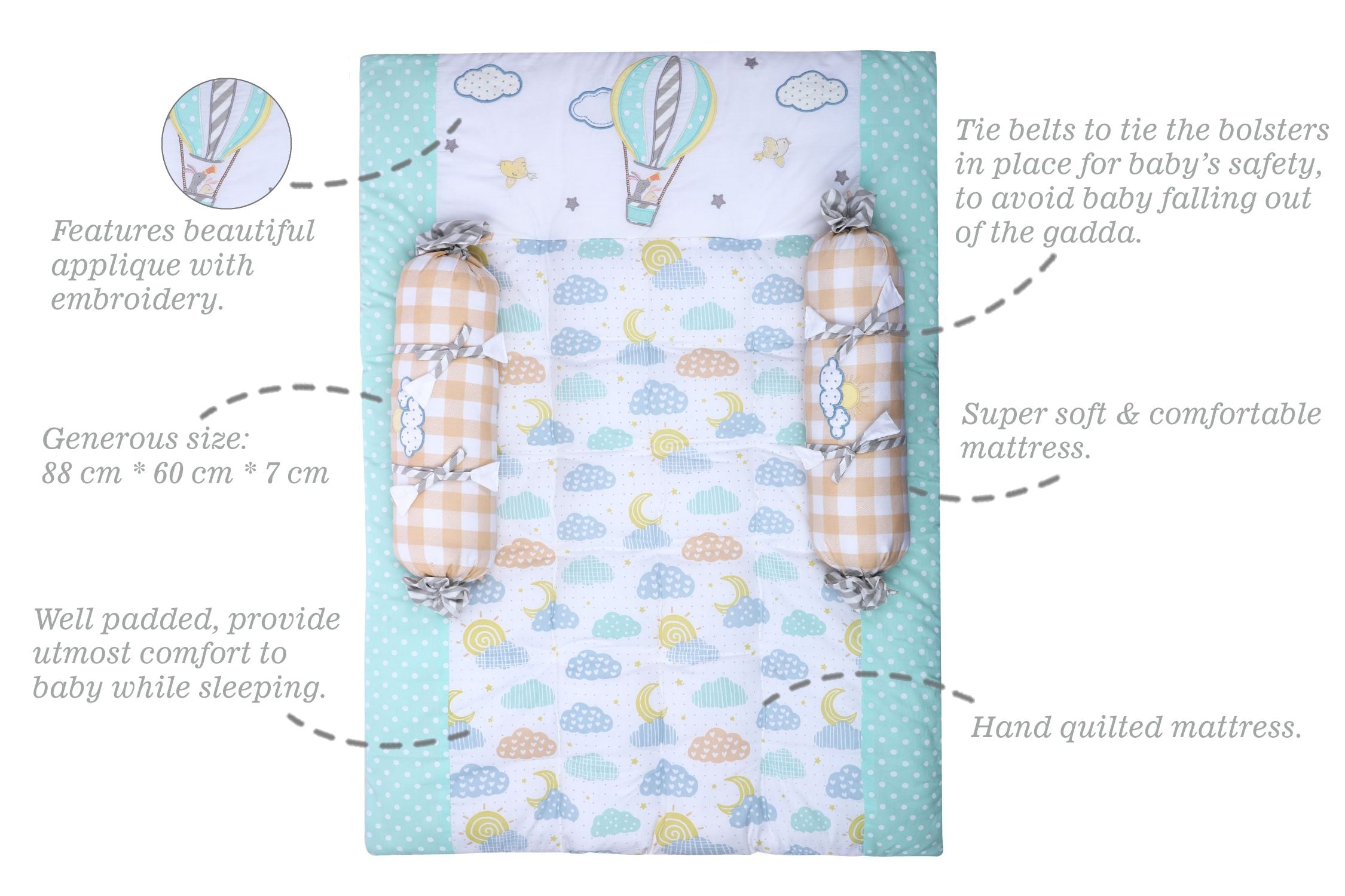 Give your newborn the softest start with our Gadda Set with 2 Bolsters - Lost in Clouds — designed for cozy, safe, and peaceful sleep. Crafted with ultra-soft, breathable fabrics, this bedding set provides a snug environment perfect for your baby's delicate skin.