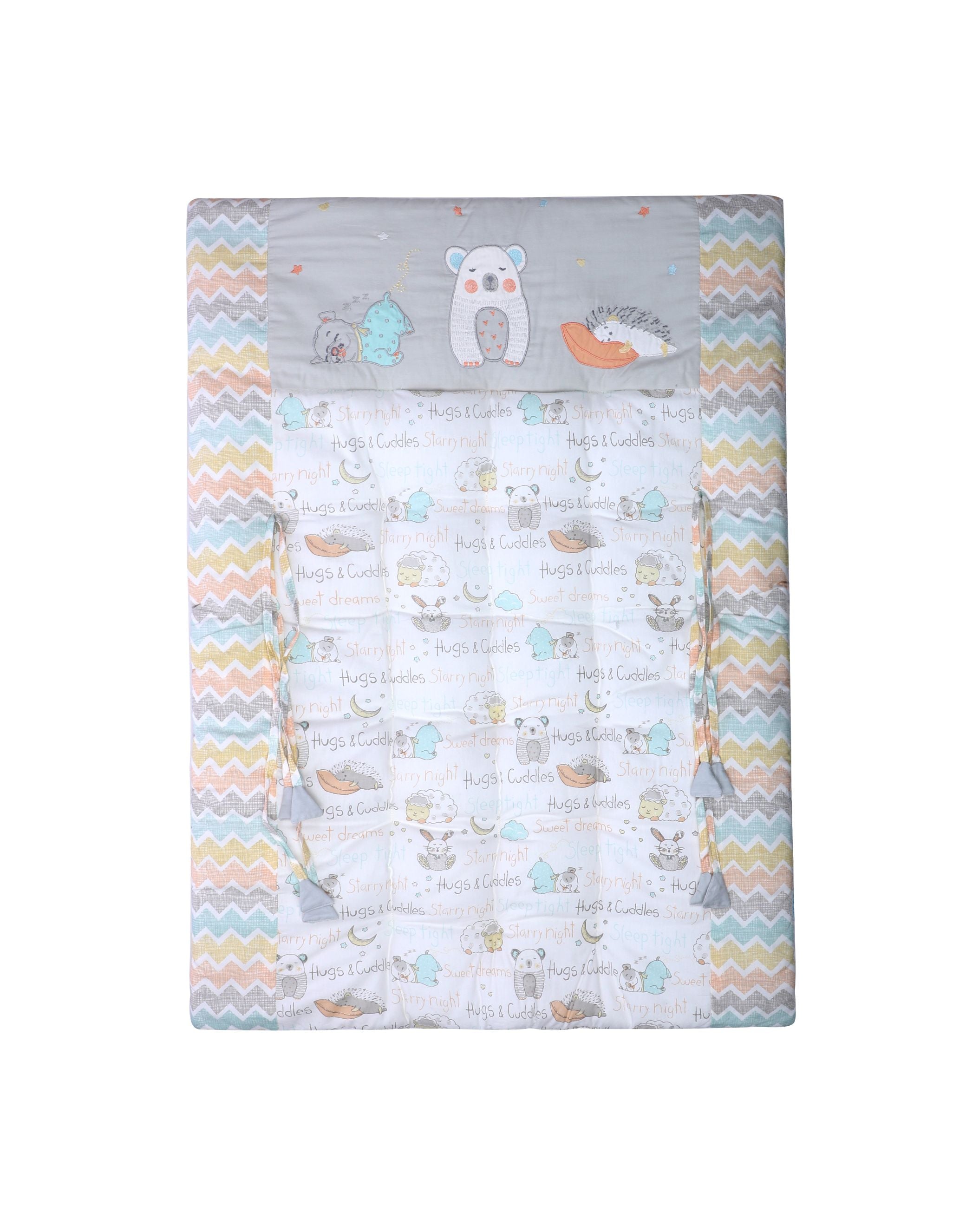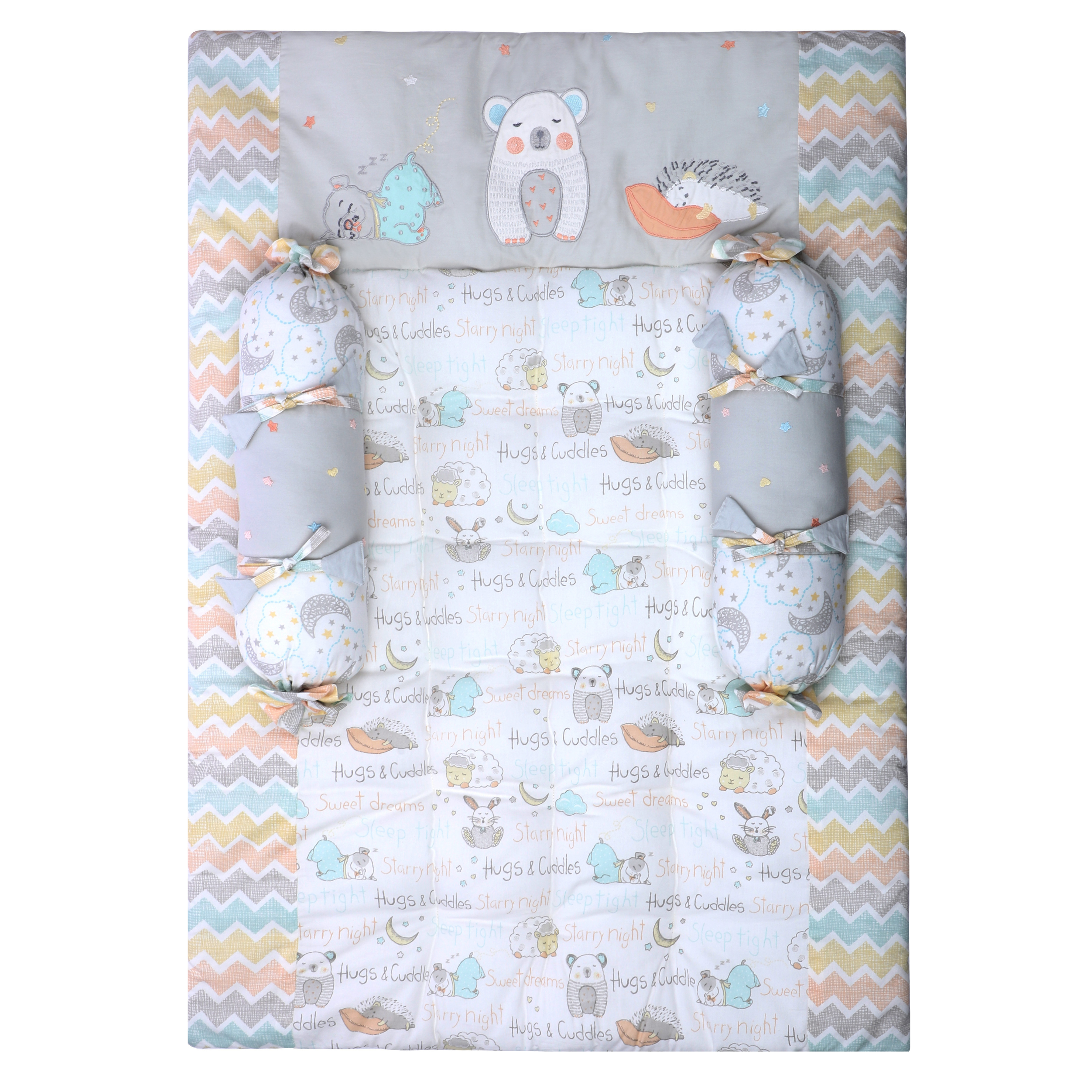 Give your newborn the softest start with our Gadda Set with 2 Bolsters - Sleepy Friends — designed for cozy, safe, and peaceful sleep. Crafted with ultra-soft, breathable fabrics, this bedding set provides a snug environment perfect for your baby's delicate skin.