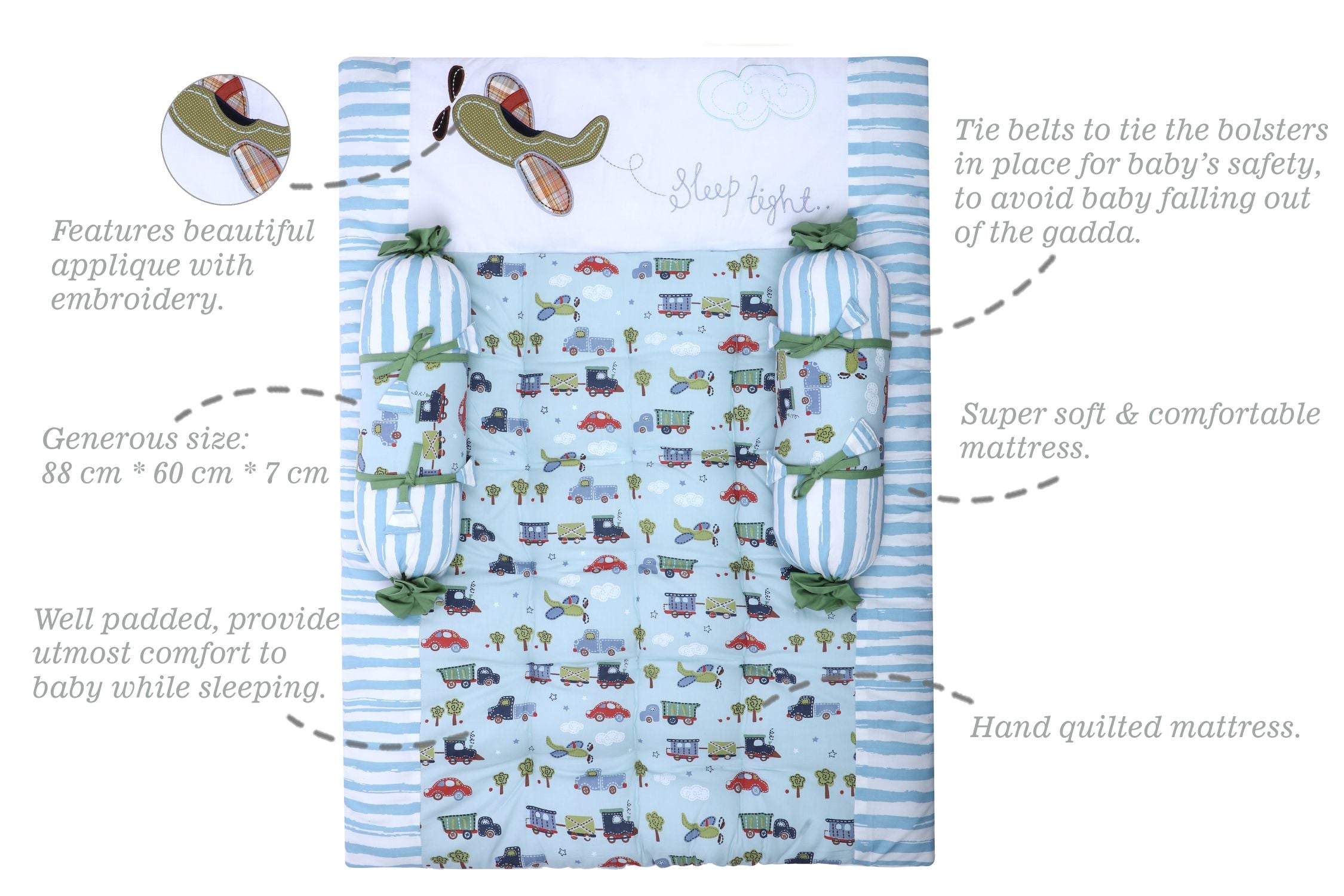 Give your newborn the softest start with our Gadda Set with 2 Bolsters - Transport — designed for cozy, safe, and peaceful sleep. Crafted with ultra-soft, breathable fabrics, this bedding set provides a snug environment perfect for your baby's delicate skin.