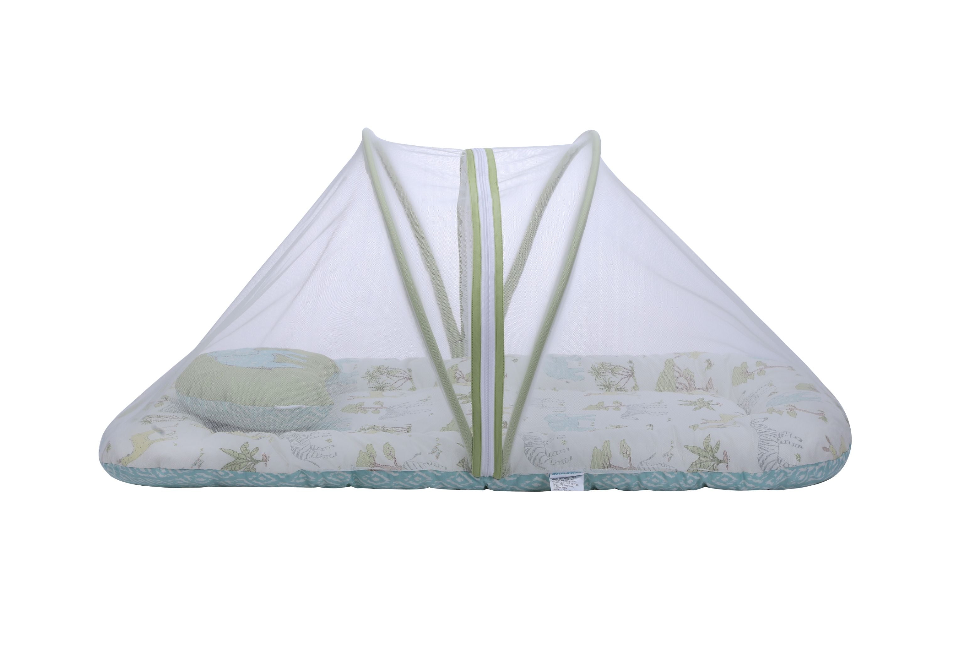Introducing our Gadda set with mosquito net which features 1 mattress and 1 adorable shape pillow and comes with an attached mosquito net for effortless use