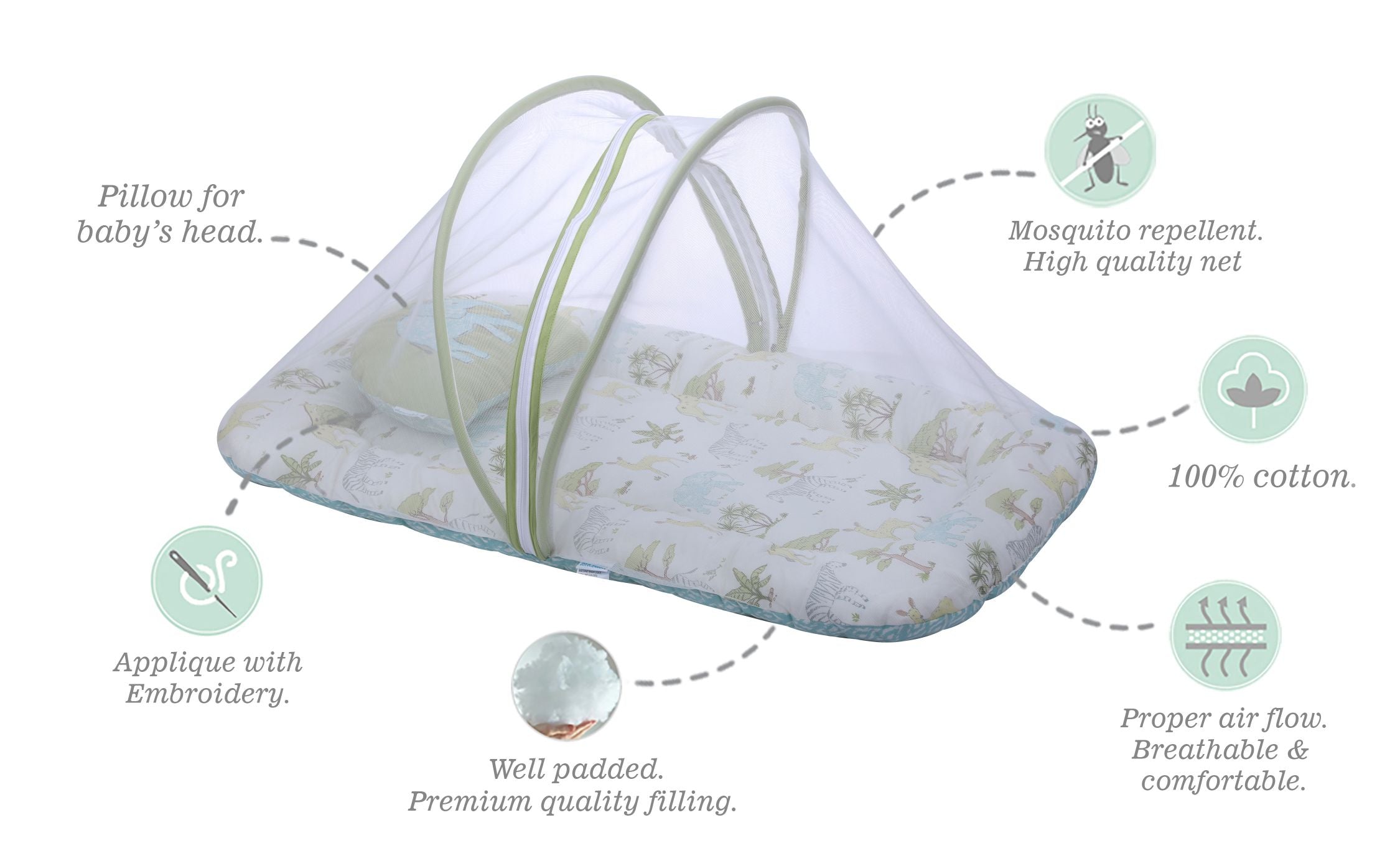 - The built-in mosquito net provides reliable protection against insects and mosquitoes, ensuring your baby can rest peacefully. Designed for optimal airflow, the net creates a secure and cozy environment for your little one