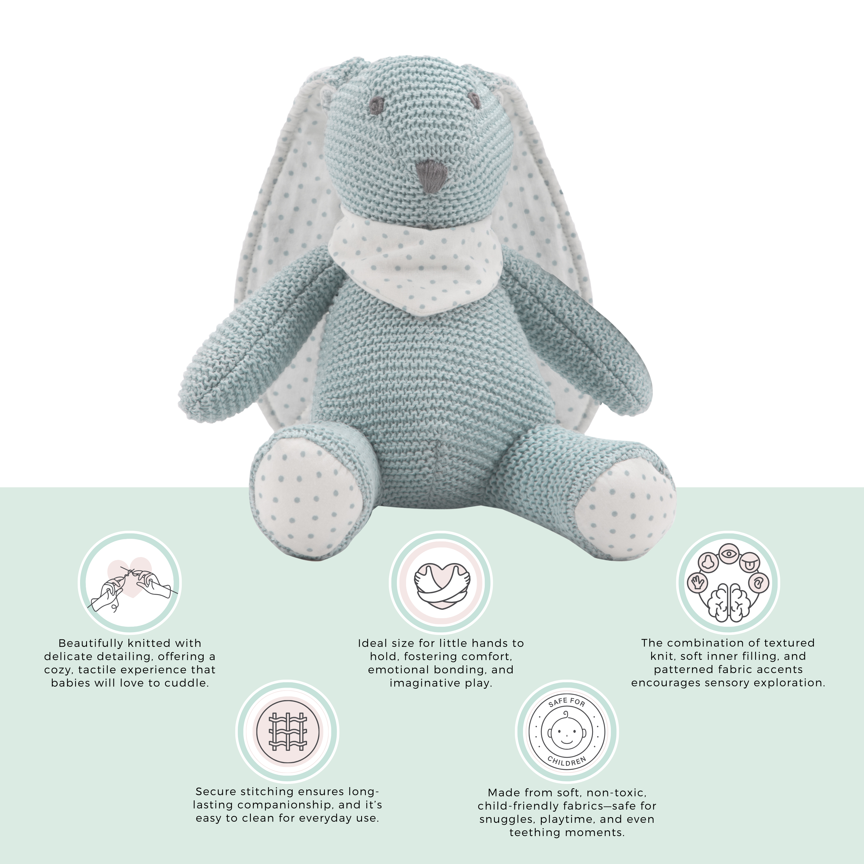 Meet Millie the Bunny, a knitted baby soft toy made for snuggles, comfort, and charm. Lovingly crafted from gentle, baby-safe yarn, Millie features long floppy ears with polka-dot fabric, matching paws, and a cute little scarf that adds to her personality. Whether placed in a nursery, added to a baby gift hamper, or cuddled during naptime, this plush bunny brings warmth and joy to little ones. Ideal for newborns, infants, and toddlers, Millie is a perfect choice for baby shower gifts, first birthdays, or keepsake toys that last through early childhood.