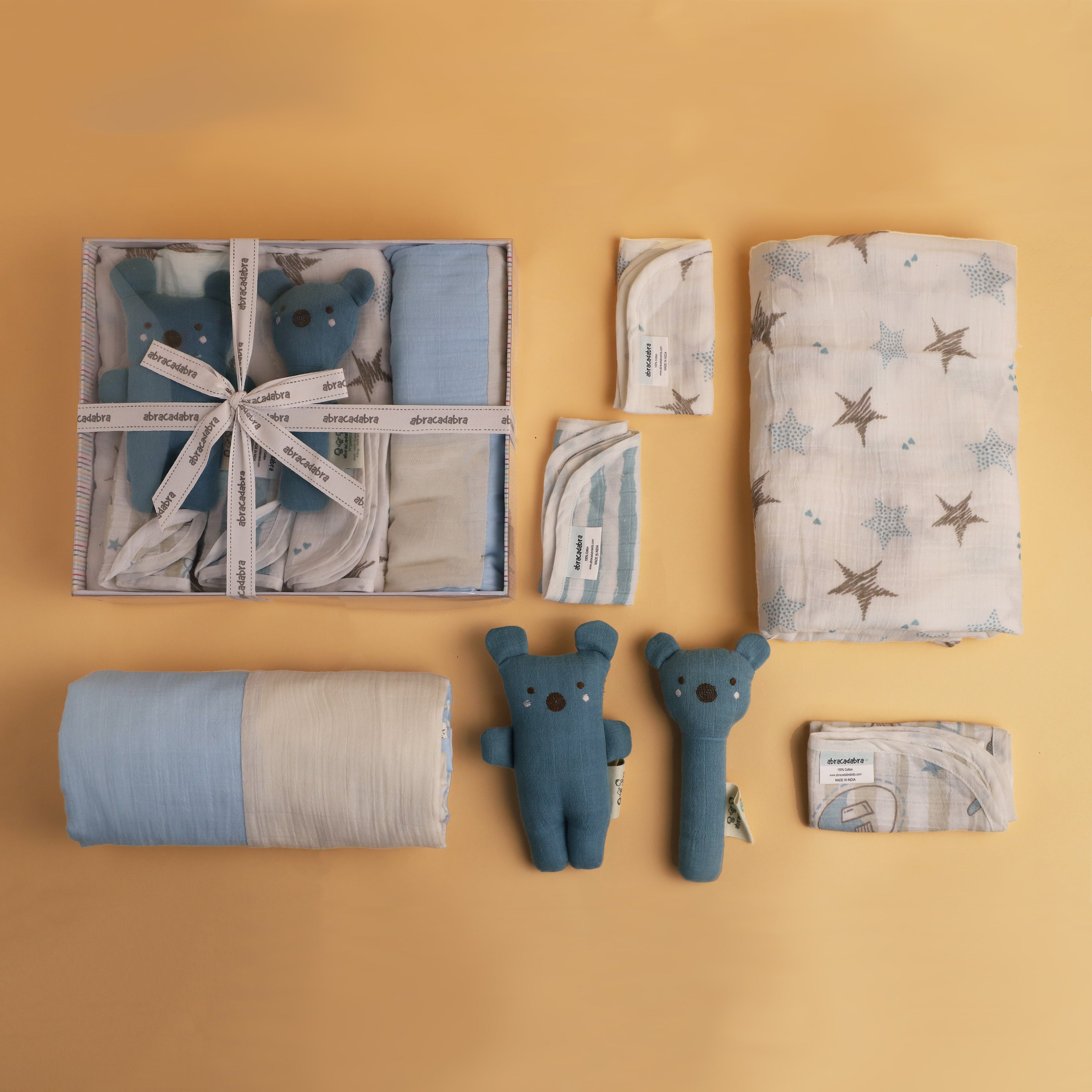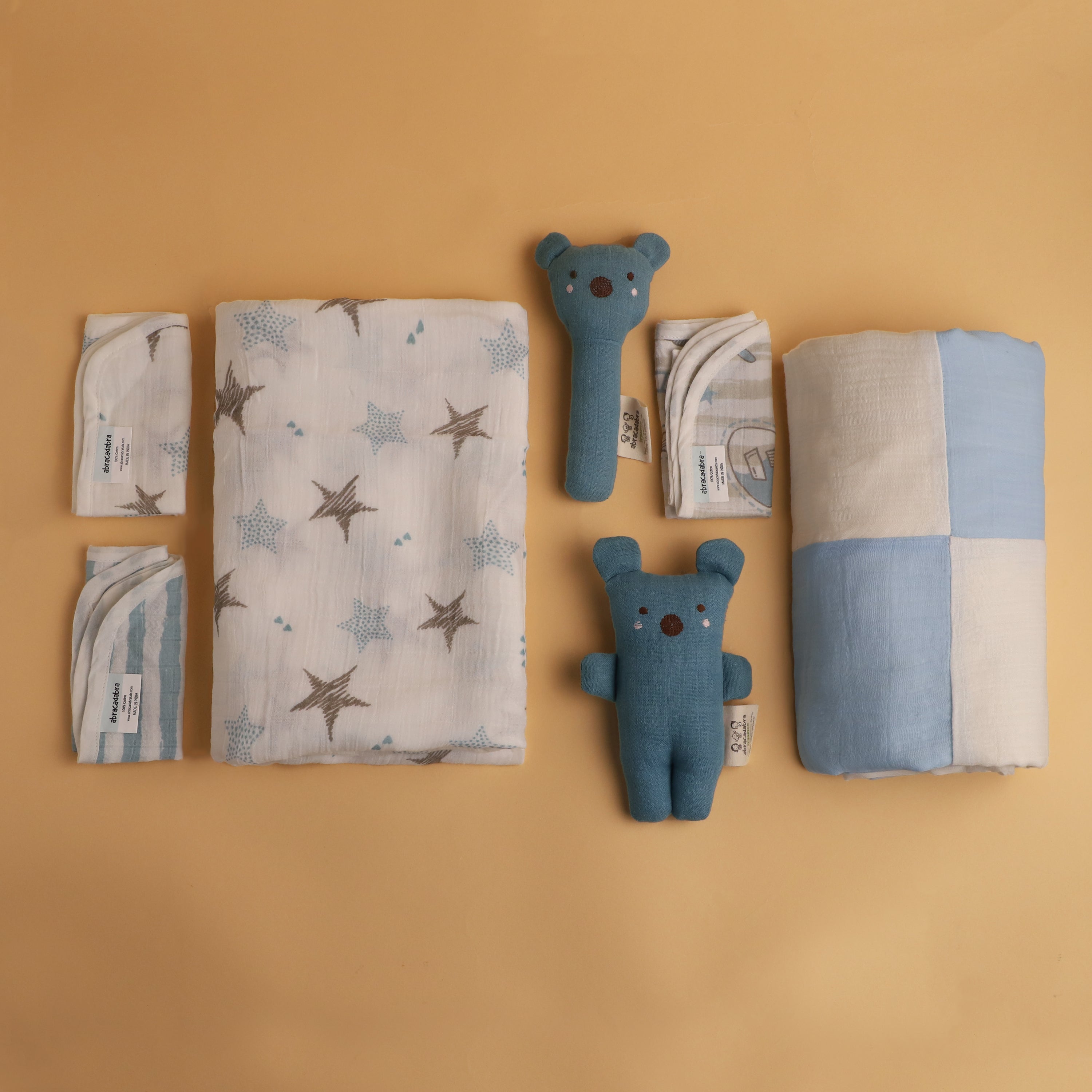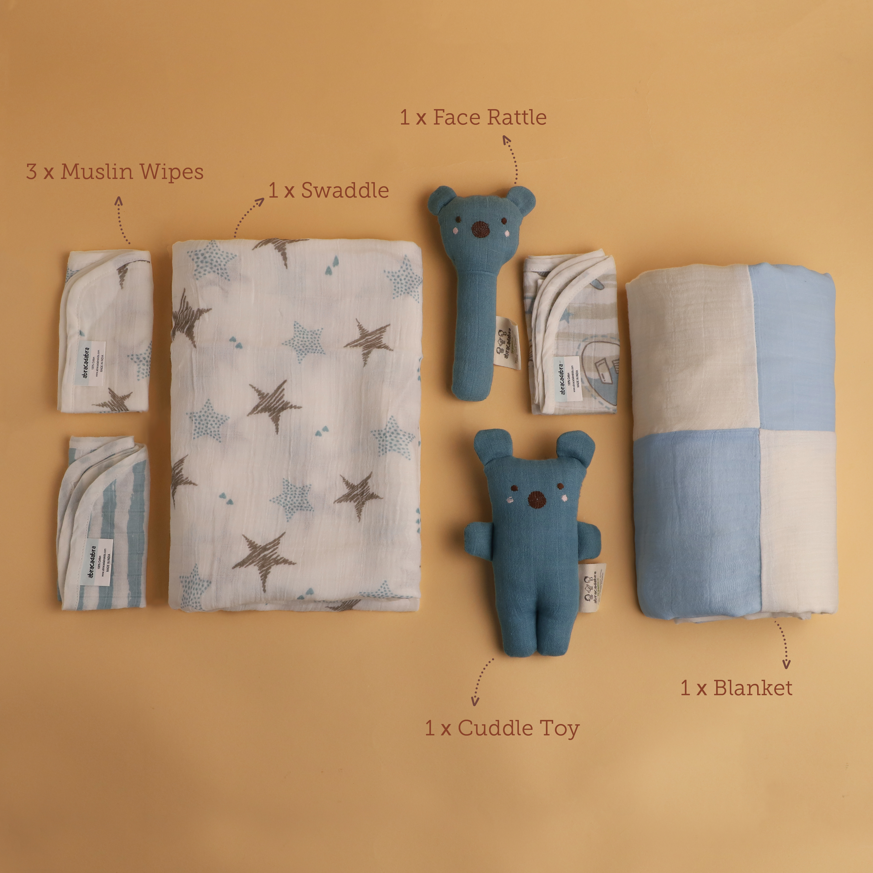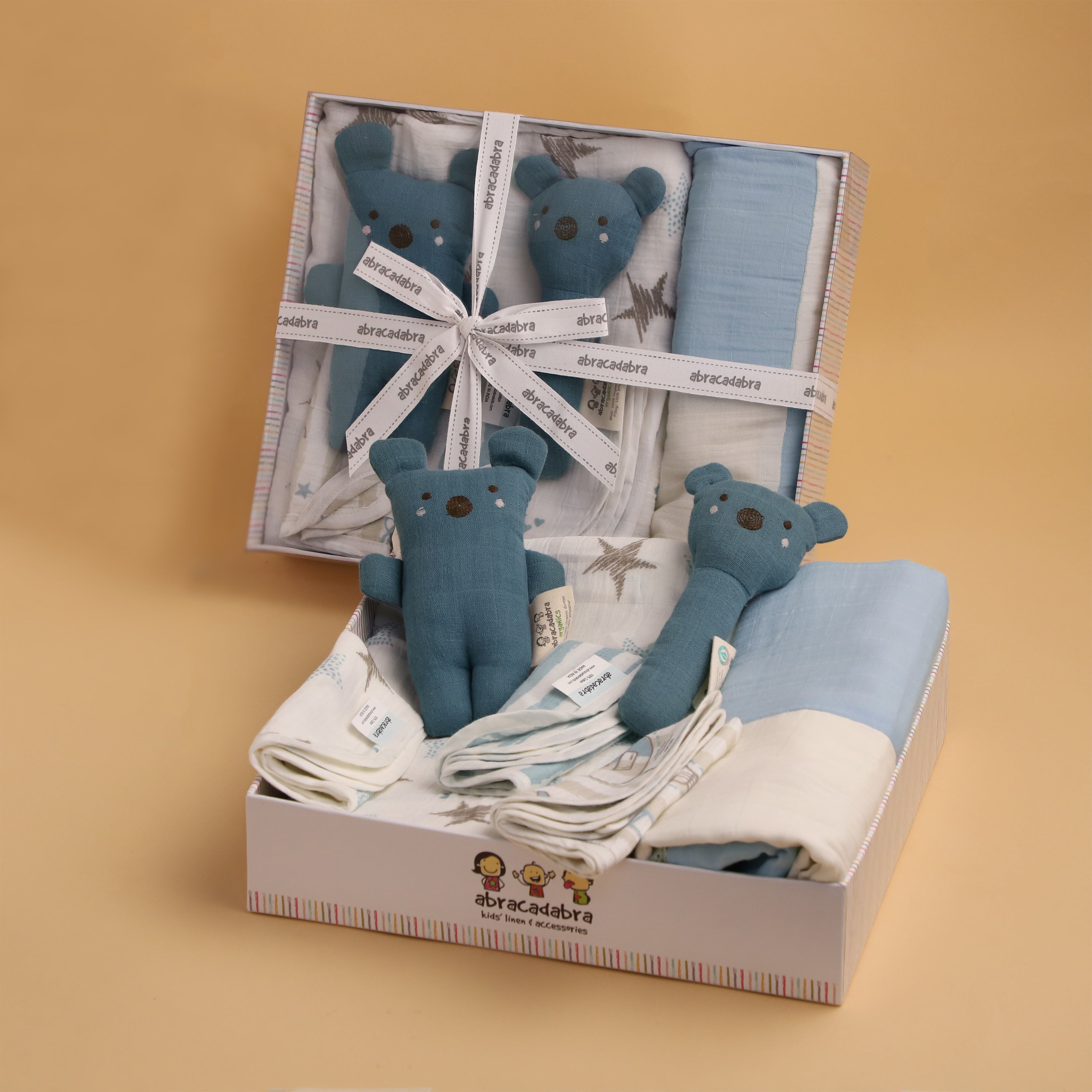 Quantity: 5N , Blanket - 106 x 106 cm, Swaddle - 110 x 110 cm, Muslin Wipe - 25 x 25 cm, 1 Face Rattle - 18 x 8 x 4 cm, Cuddle Toy - 18 x 10 x 4 cm