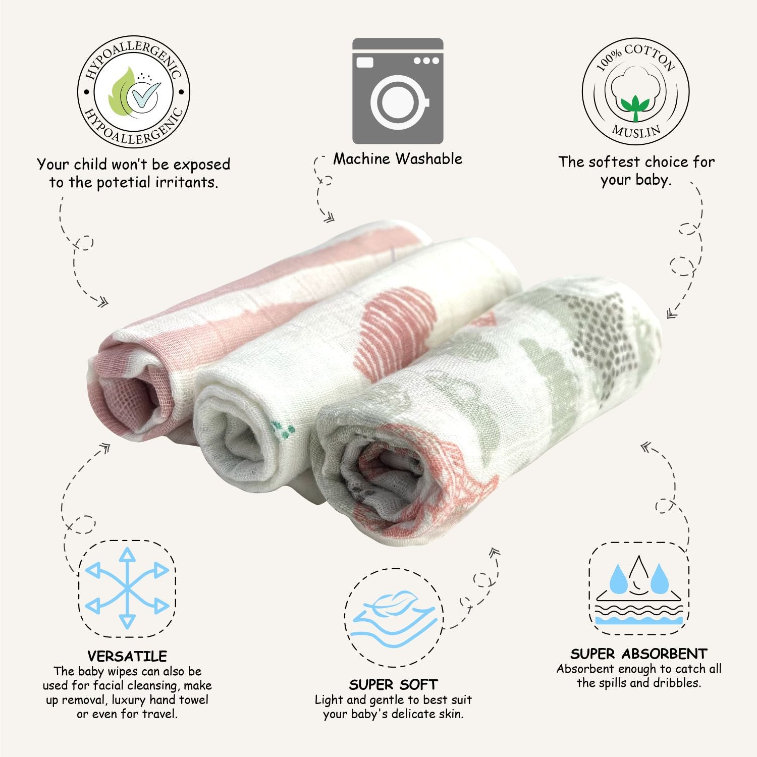 Our face wipes are crafted from 100% natural muslin fabric, ensuring a soft and gentle touch on the baby's skin. They are hypo allergenic, delicate and get softer with every wash; making them ideal for new borns and toddlers. The wipes are absorbent and make sure meal-time remains clean and tidy. Available in a variety of colourful themes and designs