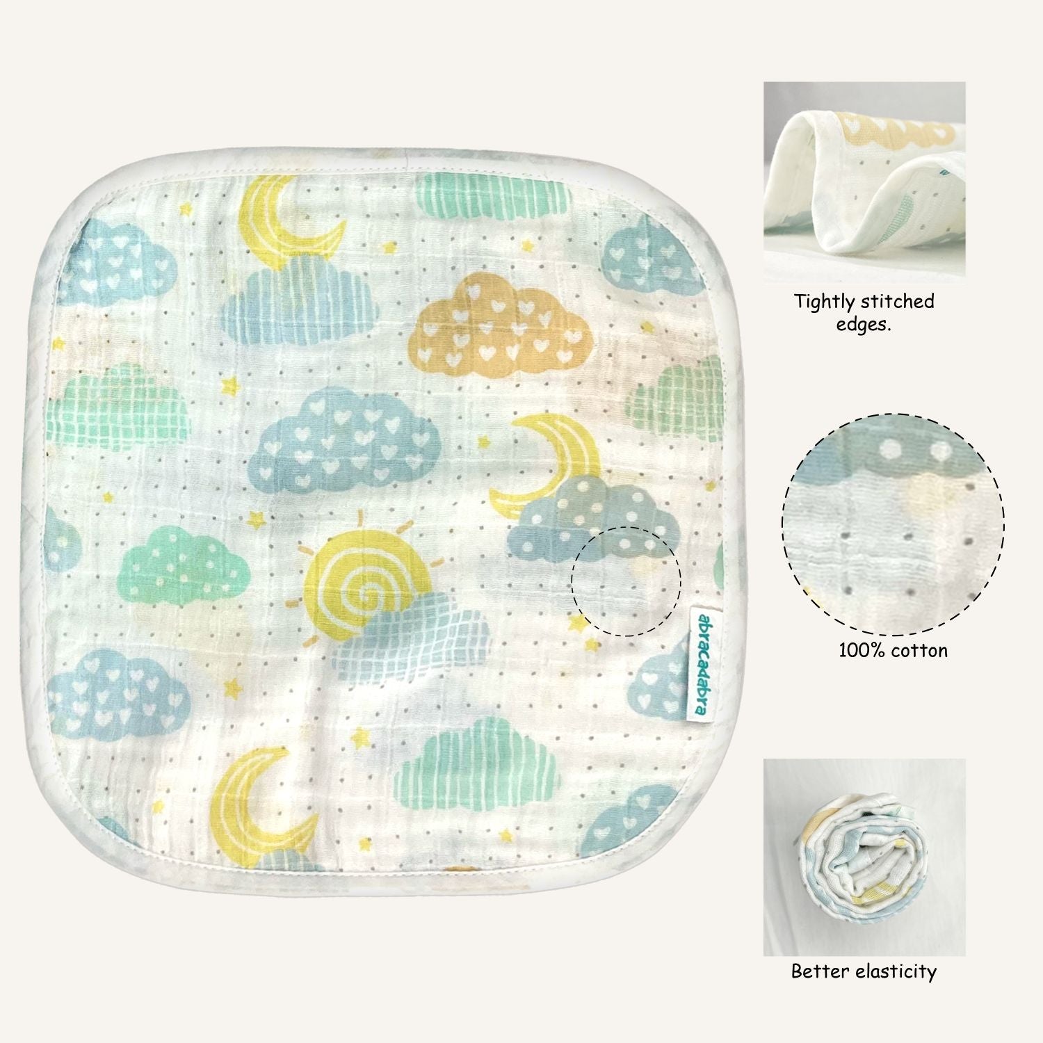 Our face wipes are crafted from 100% natural muslin fabric, ensuring a soft and gentle touch on the baby's skin. They are hypo allergenic, delicate and get softer with every wash; making them ideal for new borns and toddlers. The wipes are absorbent and make sure meal-time remains clean and tidy. Available in a variety of colourful themes and designs