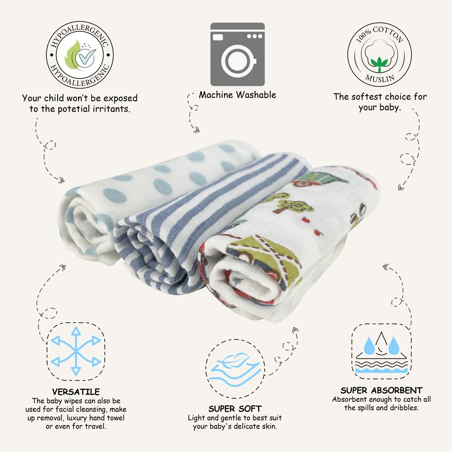 Our face wipes are crafted from 100% natural muslin fabric, ensuring a soft and gentle touch on the baby's skin. They are hypo allergenic, delicate and get softer with every wash; making them ideal for new borns and toddlers. The wipes are absorbent and make sure meal-time remains clean and tidy. Available in a variety of colourful themes and designs