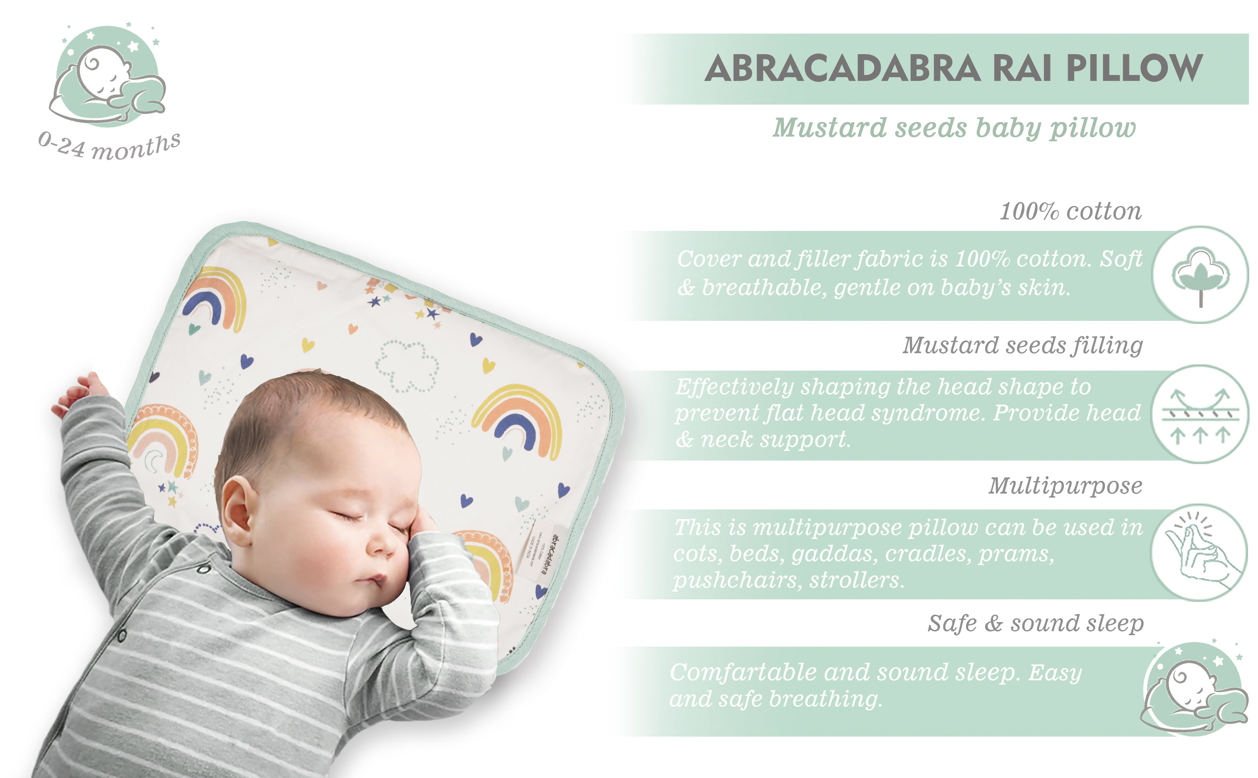- Filled with 750 grams of mustard seeds, this pillow provides essential neck support and ensures a comfortable headspace for your little one. Infused with lavender essence to promote a good night's rest for your little one