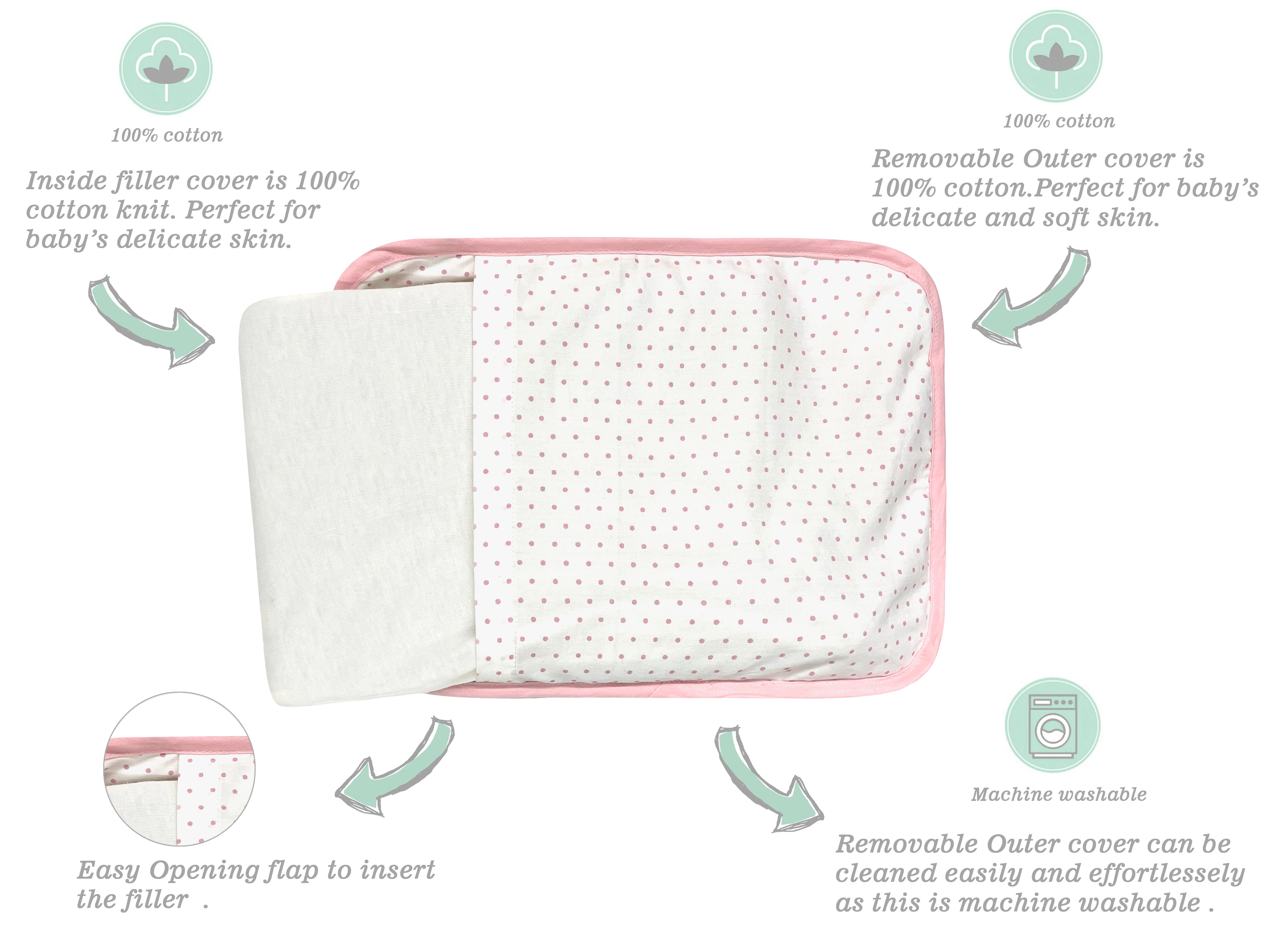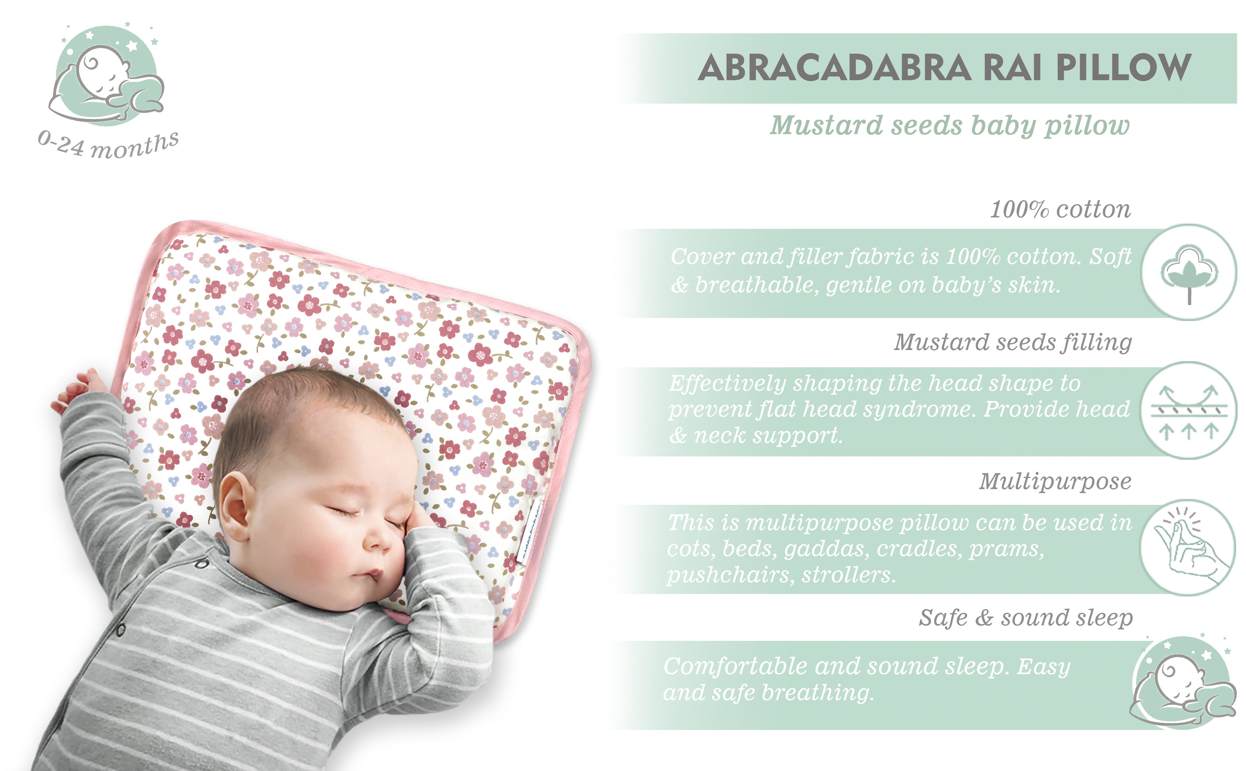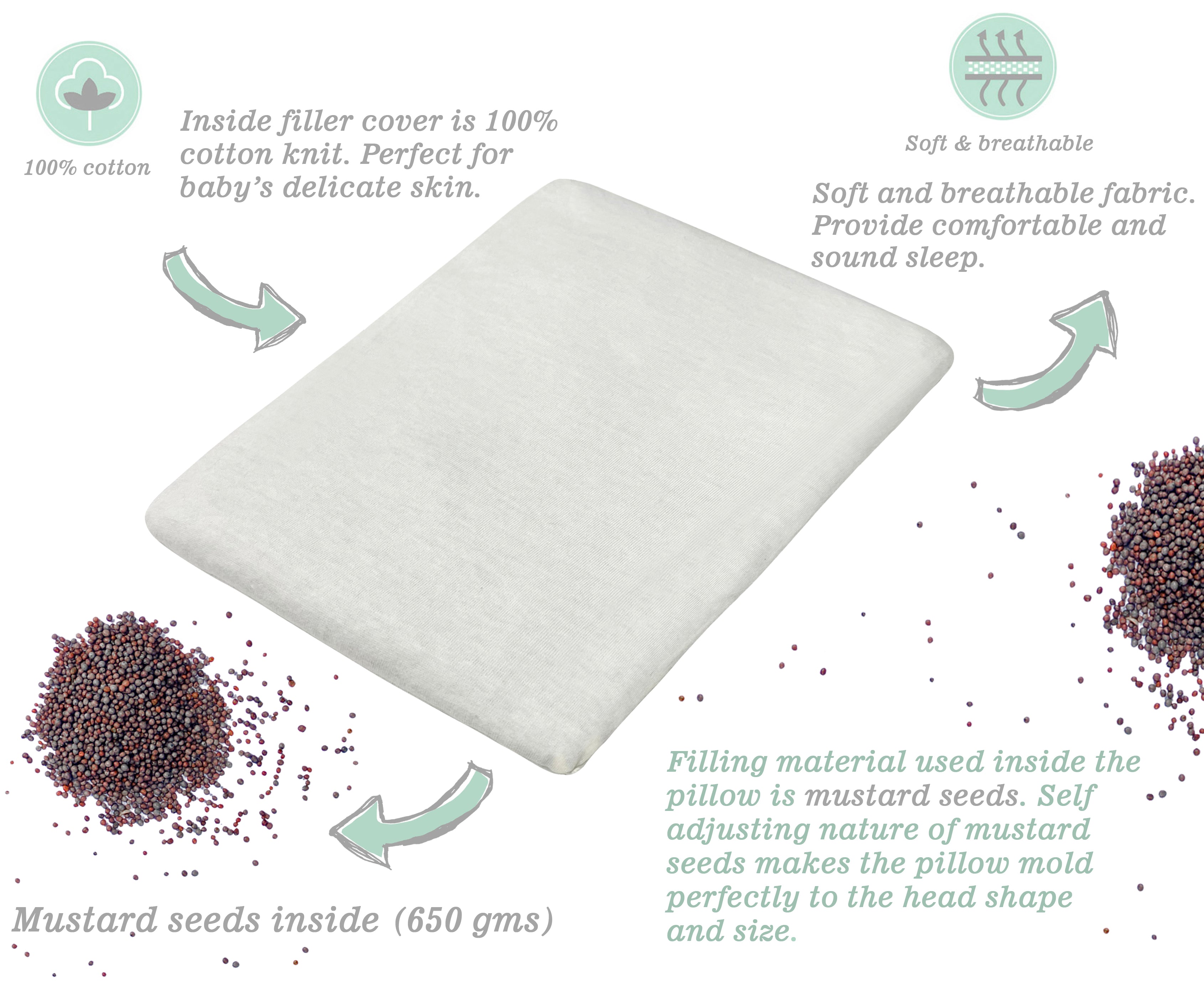 Embrace traditional baby care with our Mustard Seed Pillow, designed to offer crucial head support and shape for a smooth contour. The pillow's outer shell is crafted entirely from cotton, while its stuffing consists of tiny, triple-cleaned mustard seeds—100% natural and therapeutic-graded. Beyond promoting air circulation, this unique filling adapts to the baby's head shape, ensuring optimal comfort and well-being