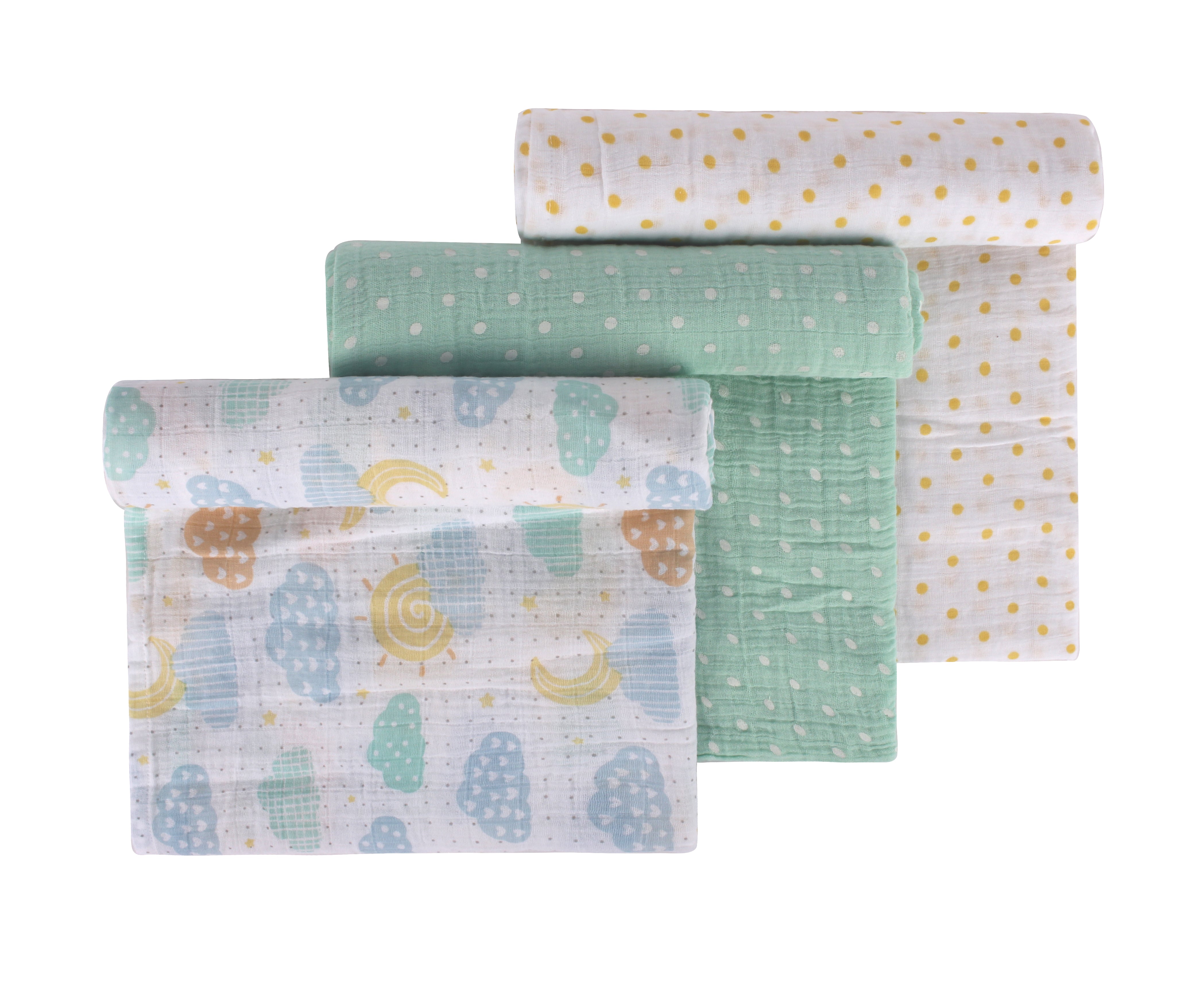Experience the magic of comfort and safety with Abracadabra's double-layer, ultra-soft cotton muslin swaddling sheets. Designed for your baby's sensitive skin, these breathable and extra-large sheets provide a warm, cozy feel for prolonged sleep. they're the perfect choice for your little one's comfort. Comes in pack of 3