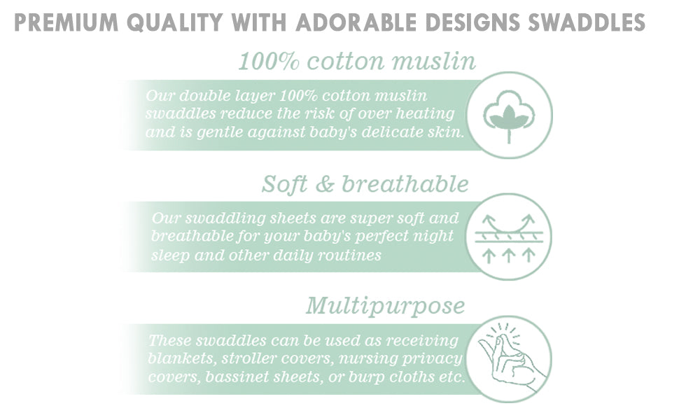 - Our swaddling receiving sheets are multi-functional, serving as burp cloths, playmats, stroller covers, privacy wraps for nursing, and bassinet sheets, offering flexibility for all your baby's needs