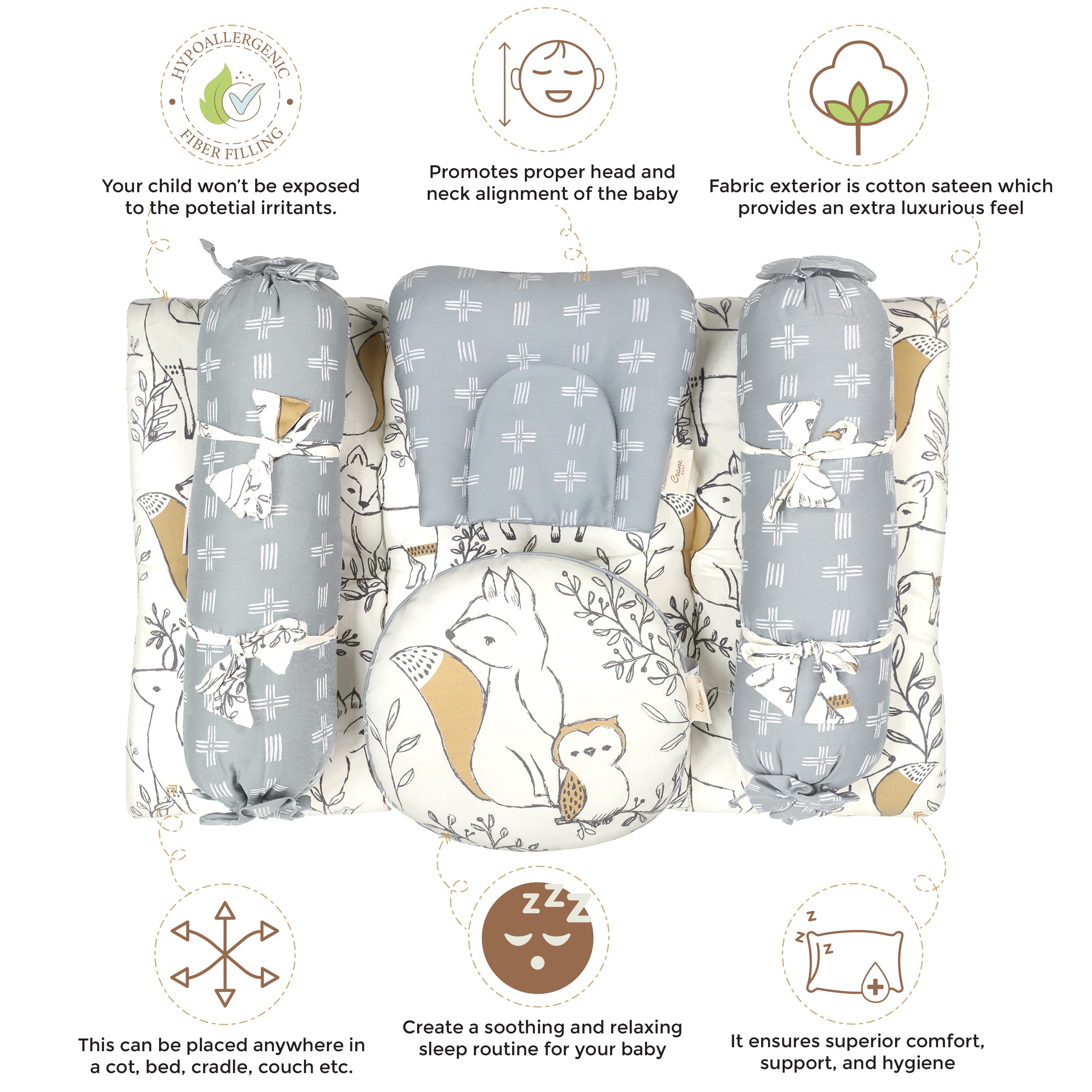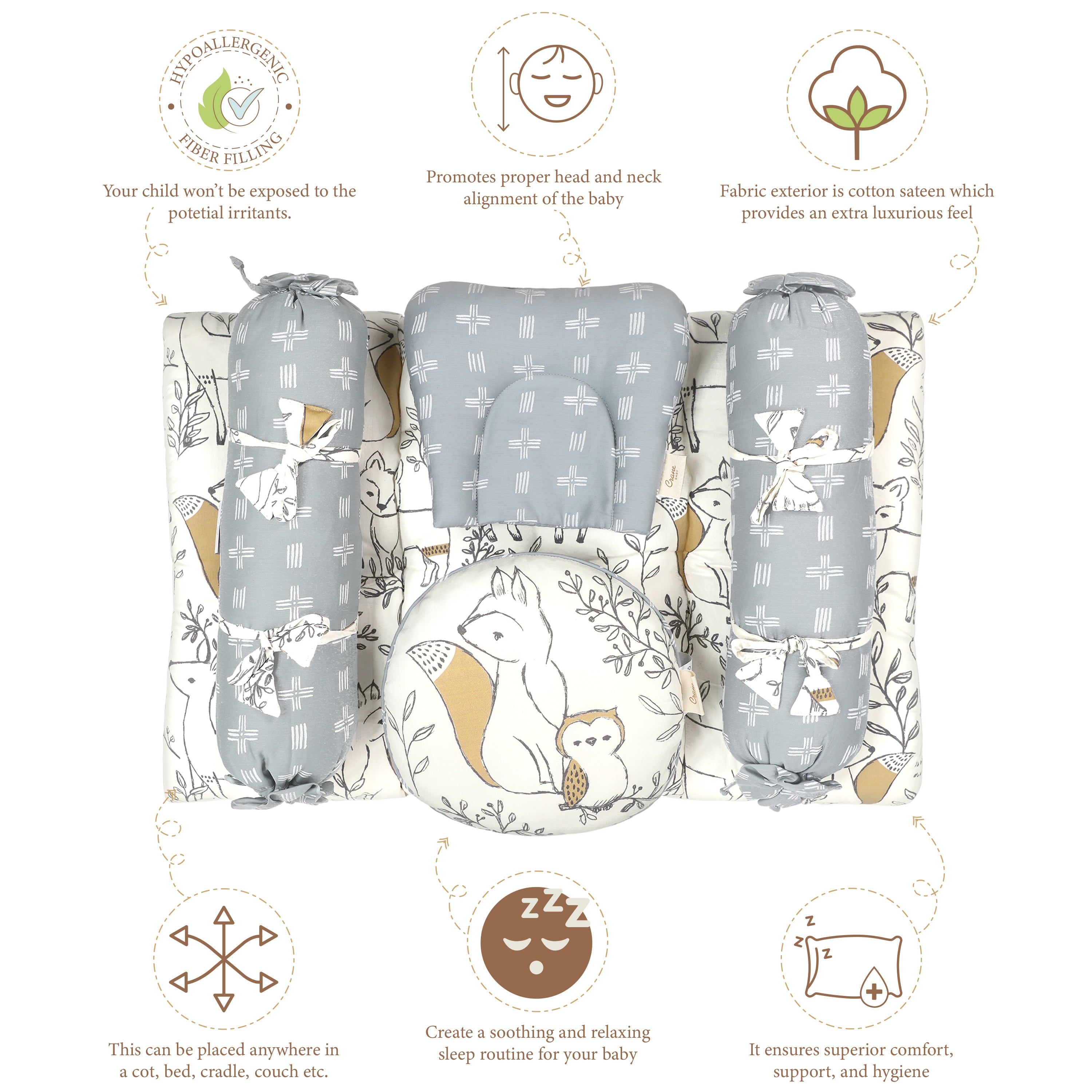 - Thoughtfully crafted for your child's comfort, our mattress set features bolsters on both sides to prevent rolling. The cavity neck pillow provides neck and head support, while the decorative pillow adds fun playtime. Perfect for naptime, playtime, and travel, this set ensures your baby stays comfortable wherever you go