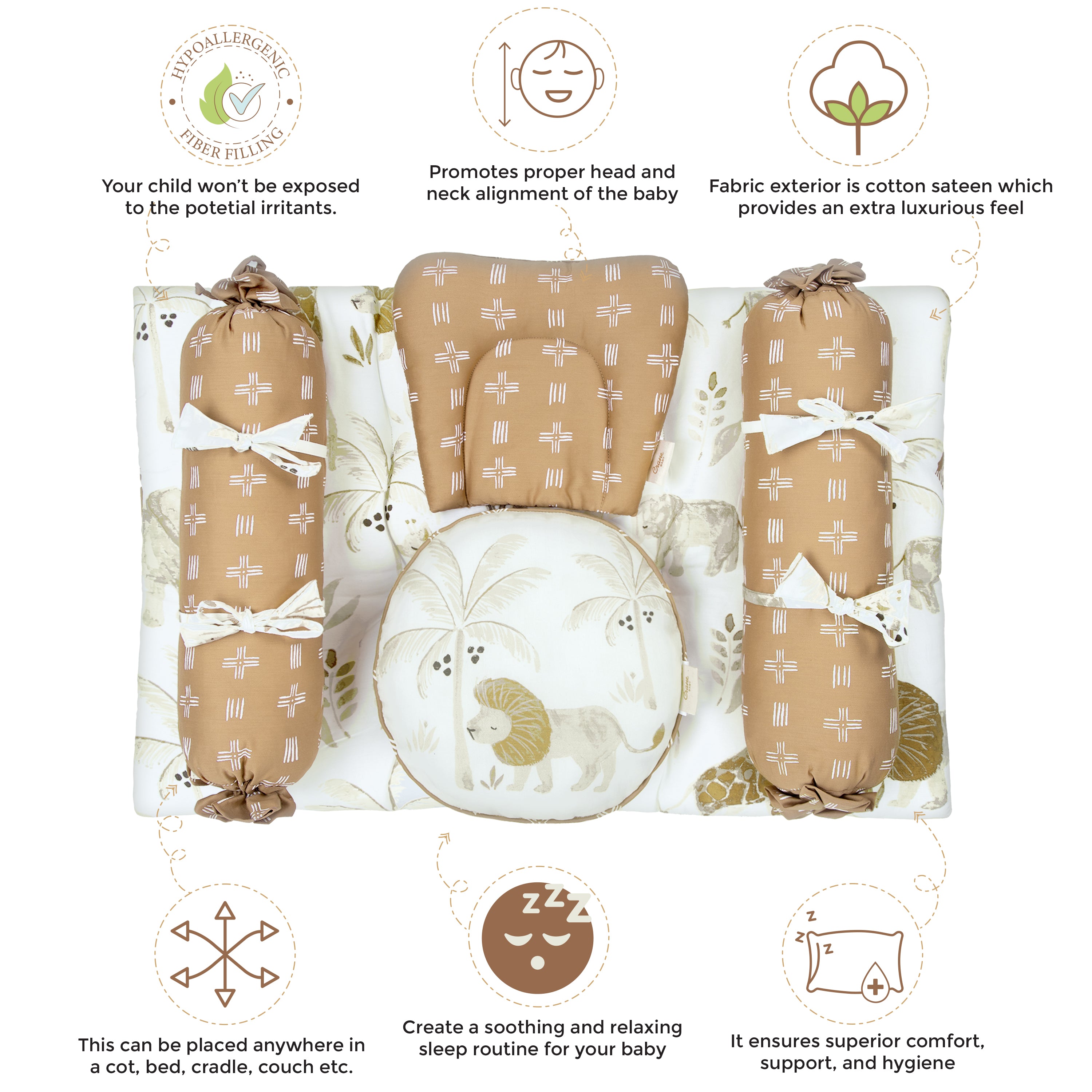 - Thoughtfully crafted for your child's comfort, our mattress set features bolsters on both sides to prevent rolling. The cavity neck pillow provides neck and head support, while the decorative pillow adds fun playtime. Perfect for naptime, playtime, and travel, this set ensures your baby stays comfortable wherever you go