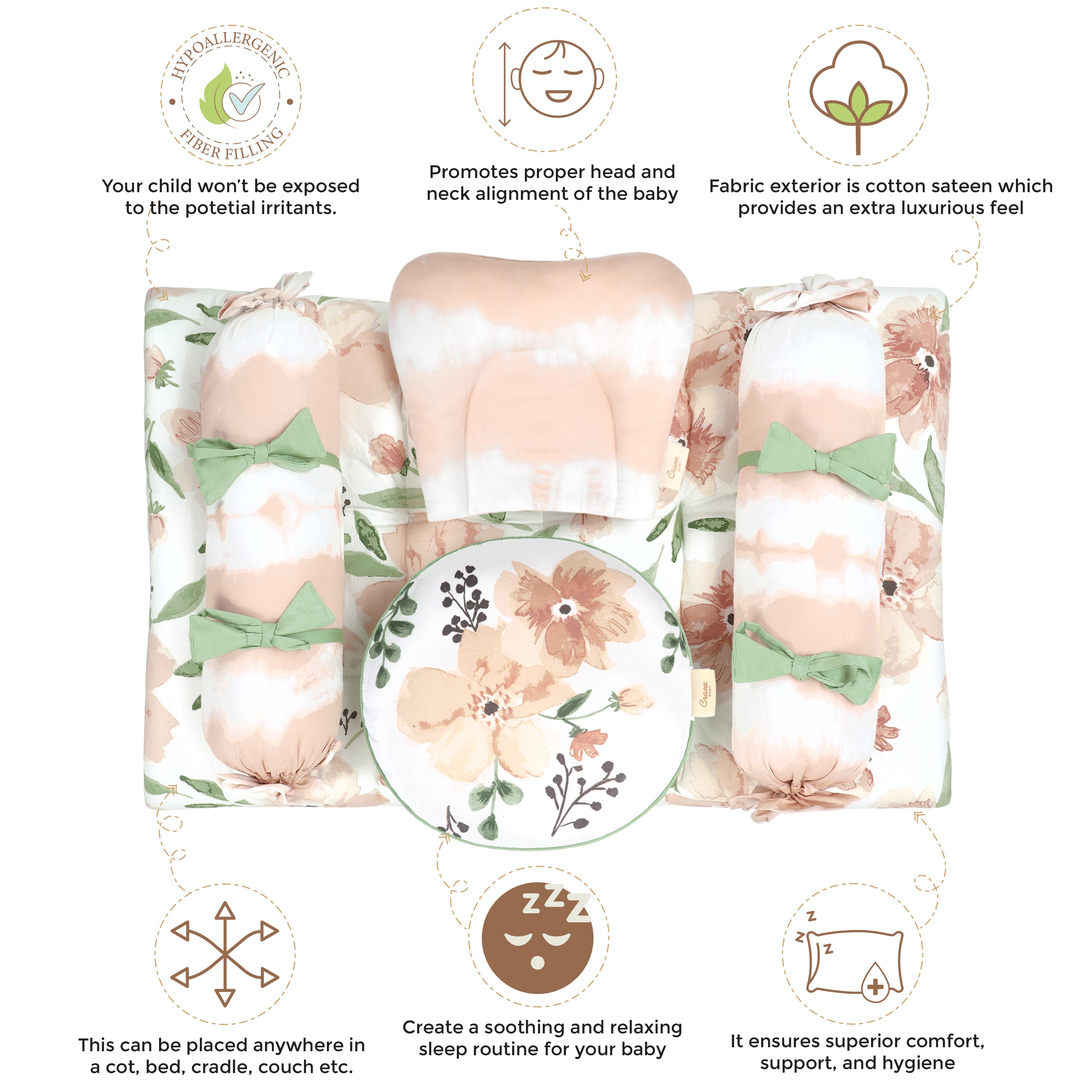 - Thoughtfully crafted for your child's comfort, our mattress set features bolsters on both sides to prevent rolling. The cavity neck pillow provides neck and head support, while the decorative pillow adds fun playtime. Perfect for naptime, playtime, and travel, this set ensures your baby stays comfortable wherever you go