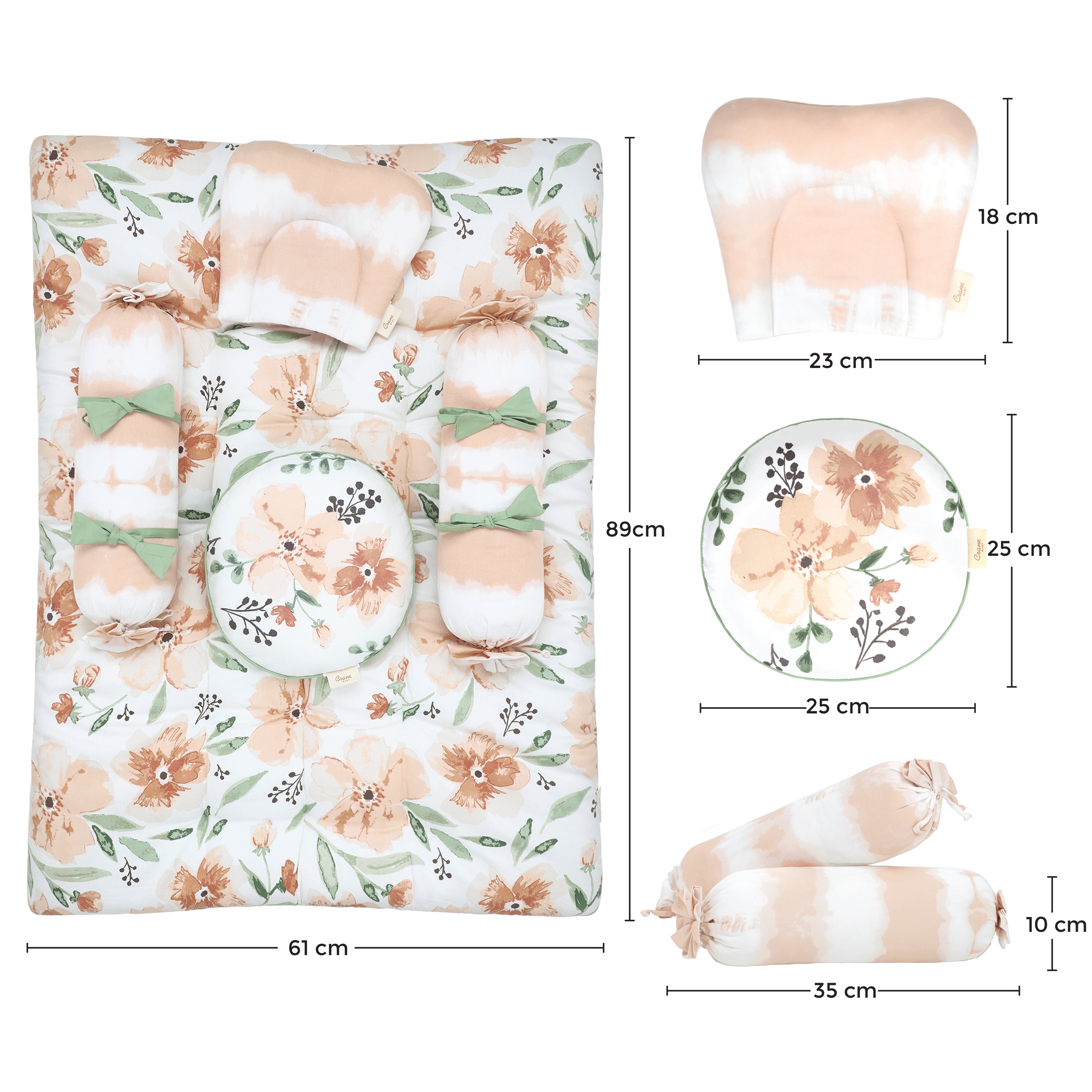 Introducing our Complete 5-Piece Mattress Set, carefully designed to cater to your baby's comfort. This adorable set includes one mattress, two bolsters, one cavity neck pillow, and one decorative pillow. With dimensions perfectly tailored for infants aged 0-2 years