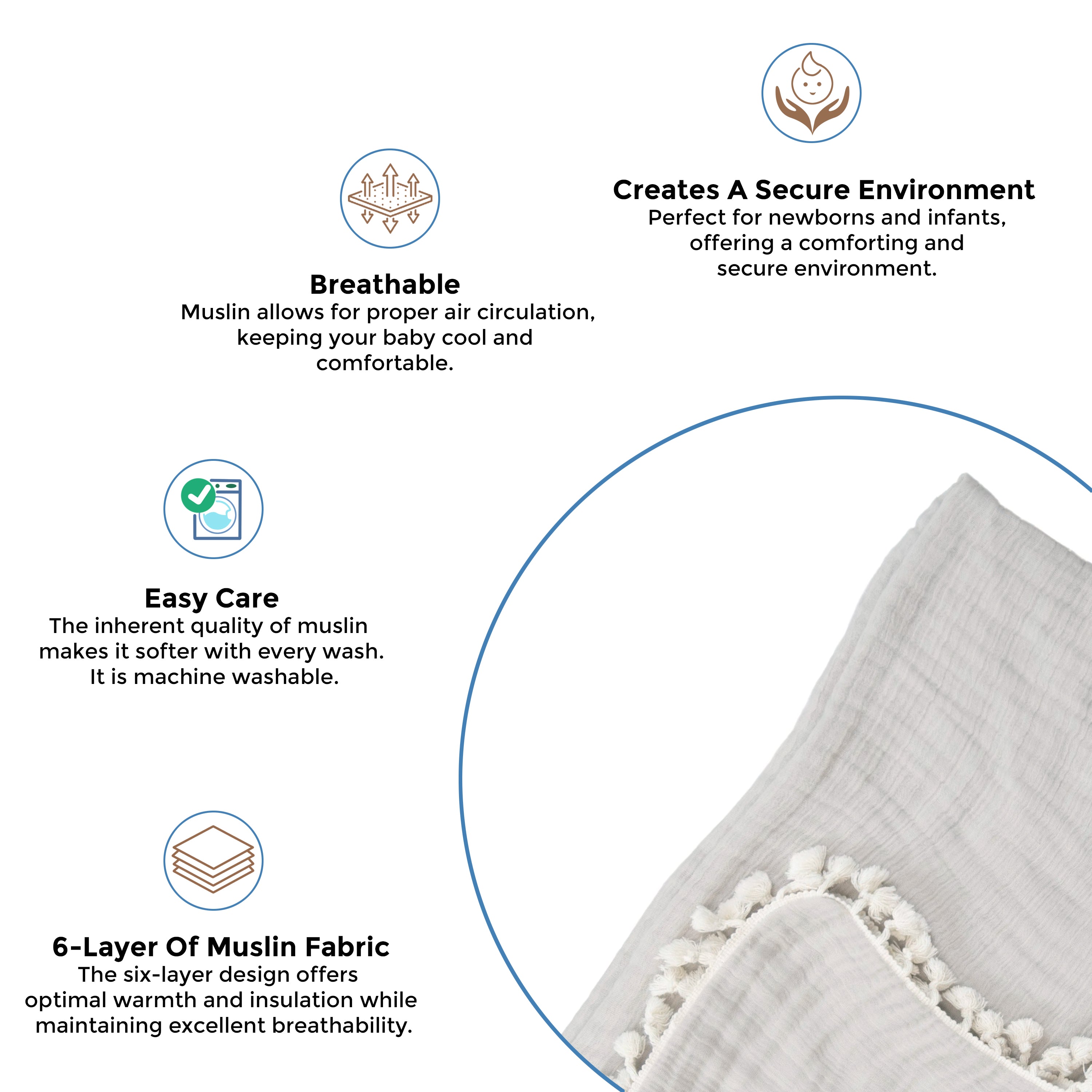 - This blanket comes with six layers of muslin, ensuring ultra soft comfort for your baby. Its 100 % cotton muslin fabric is known for being breathable best suited for newborns