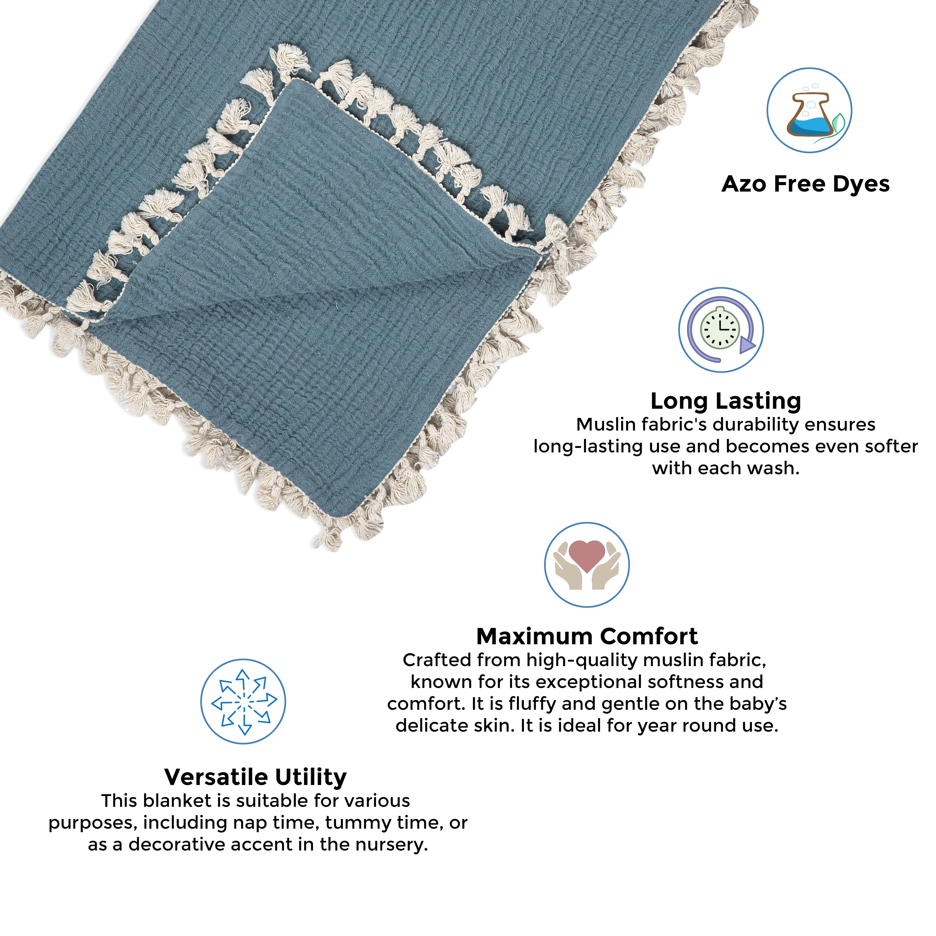 - Our blanket is hypoallergenic, baby-safe and is crafted with care. ensuring that your baby's delicate skin free from irritations or allergies. The tassel edges are soft and great for teething