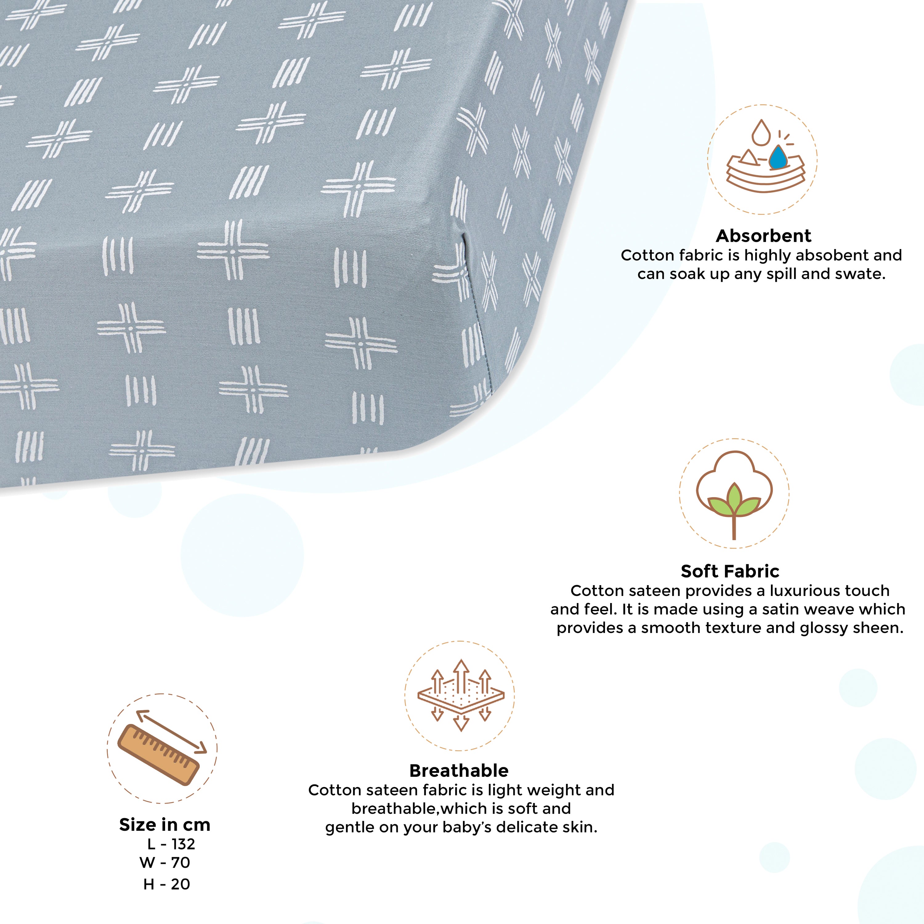 Transform your nursery with our 100% Cotton Fitted Sheet—an essential for your baby's good night sleep. Crafted from breathable cotton, this sheet guarantees a comfortable sleeping environment, Our sheet adds a natural touch of elegance to the nursery, with aesthetically pleasing designs that promote your baby's visual senses
