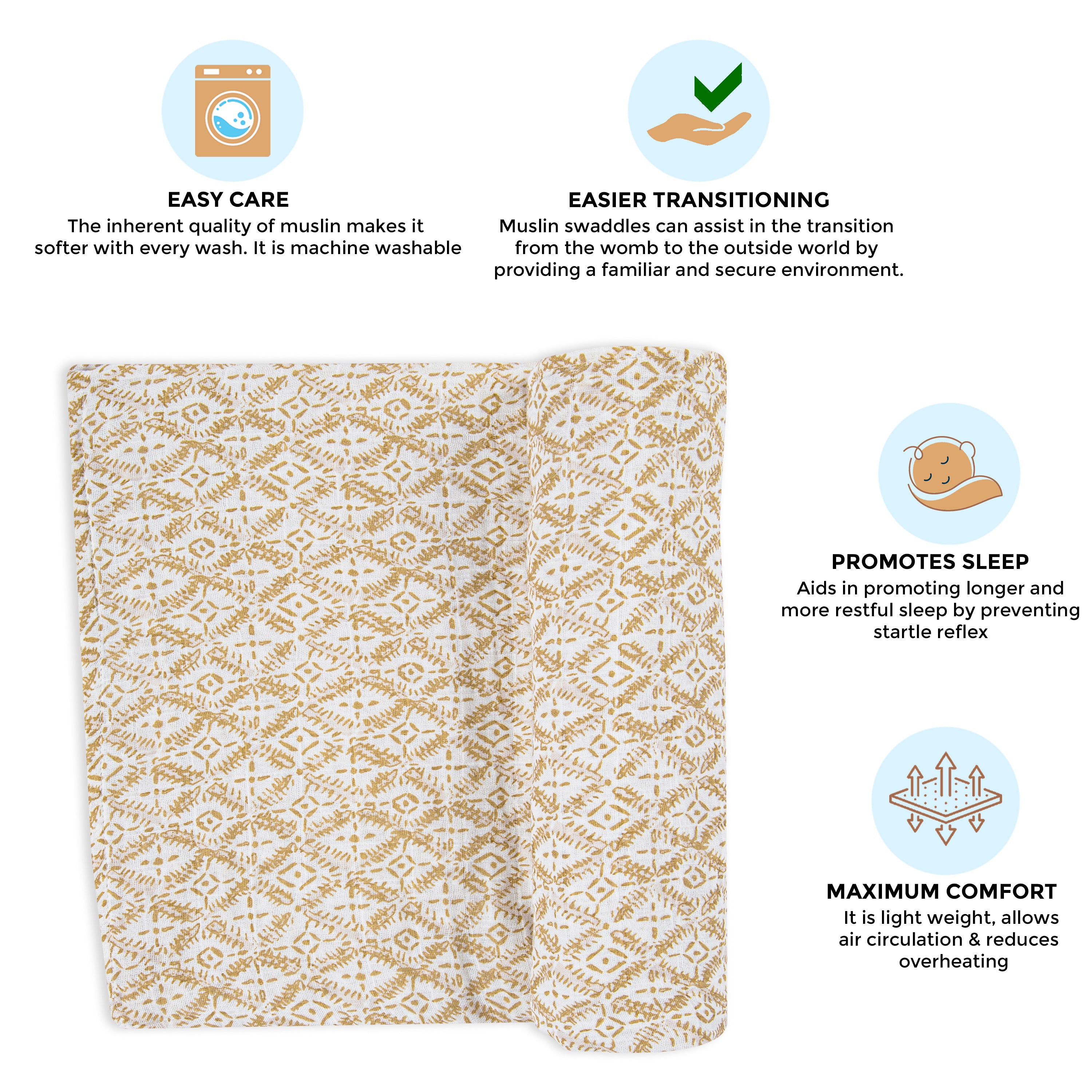 - Crafted with 100% cotton muslin, our swaddle is both light and breathable, ensuring optimal comfort for your baby. The hypoallergenic and soft material ensures a gentle touch, ensuring the safety of your baby's sensitive skin