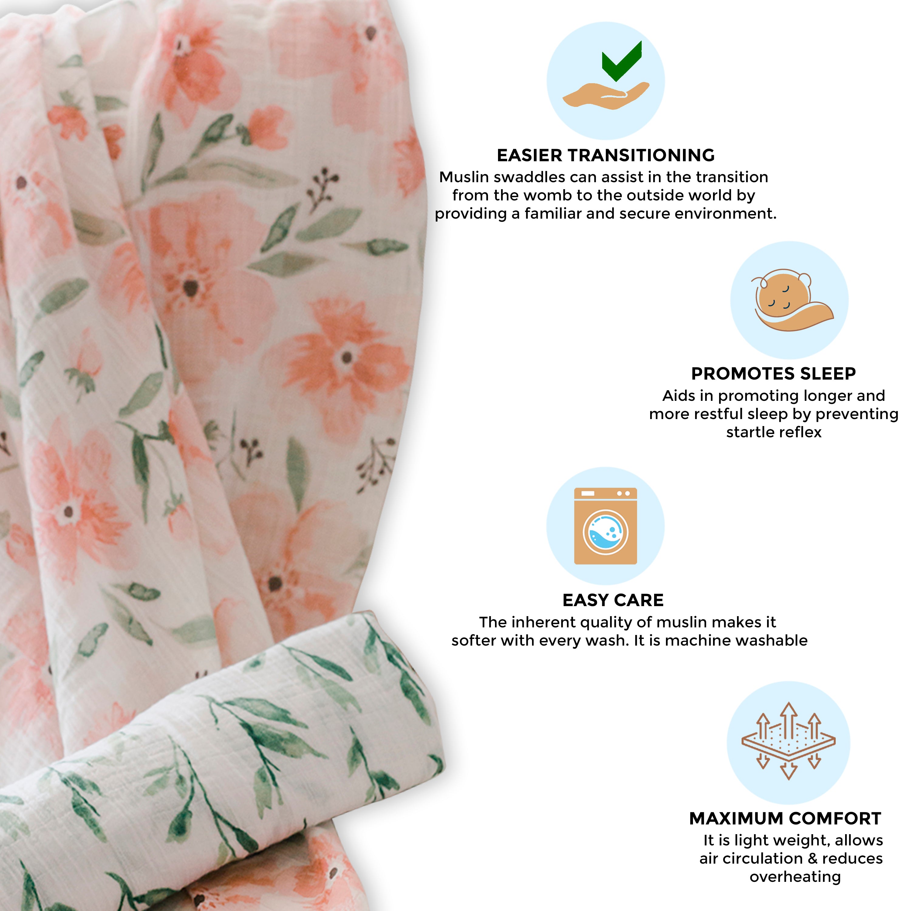 - Crafted with 100% cotton muslin, our swaddle is both light and breathable, ensuring optimal comfort for your baby. The hypoallergenic and soft material ensures a gentle touch, ensuring the safety of your baby's sensitive skin